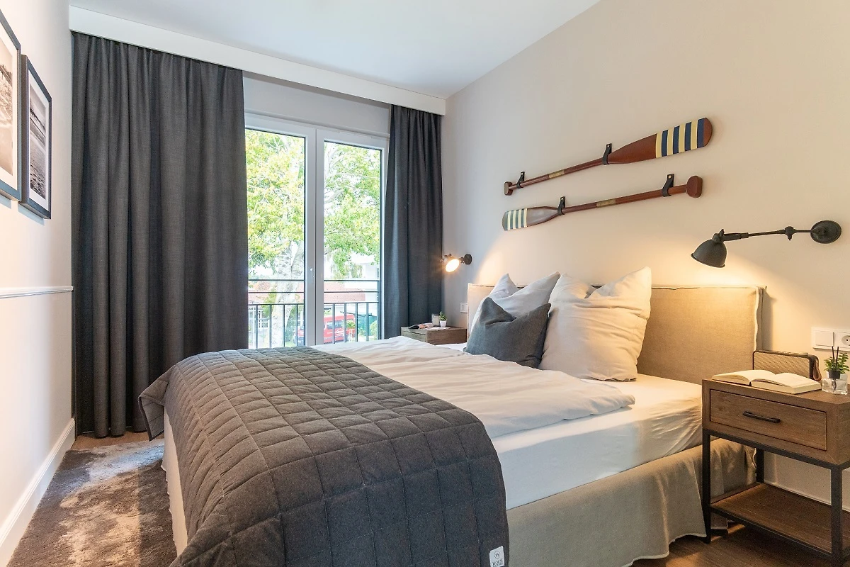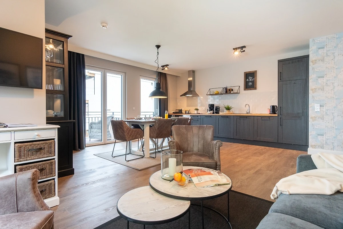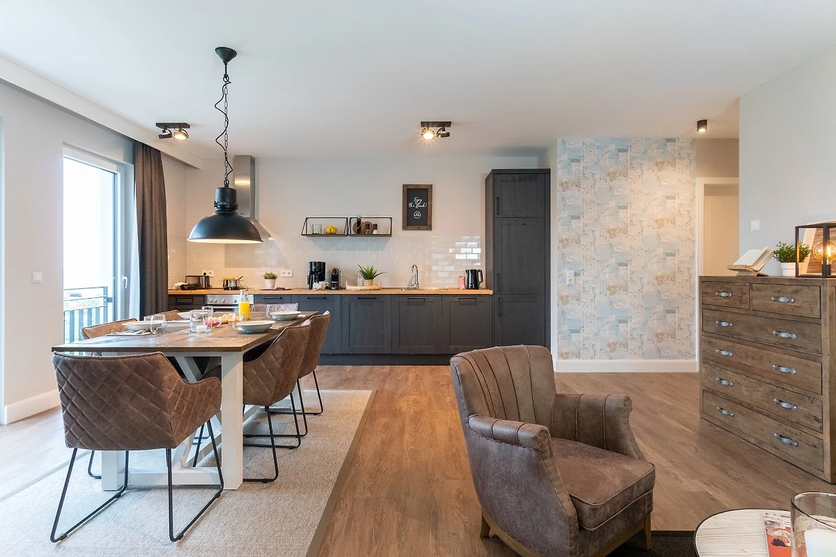 Die Ferienwohnung „Sea Lodge" bietet einen grossen, offenen Wohn- und Essbereich mit integrierter Küche, zwei Schlafzimmer, ein Bad, eine Sauna, ein Gäste-WC und einen Balkon. Ausserdem gehört zur Wohnung ein eigener Tiefgaragenstellplatz im Haus.