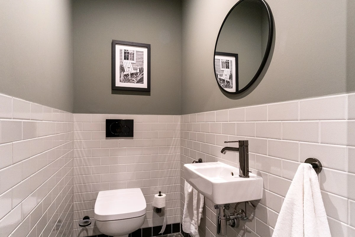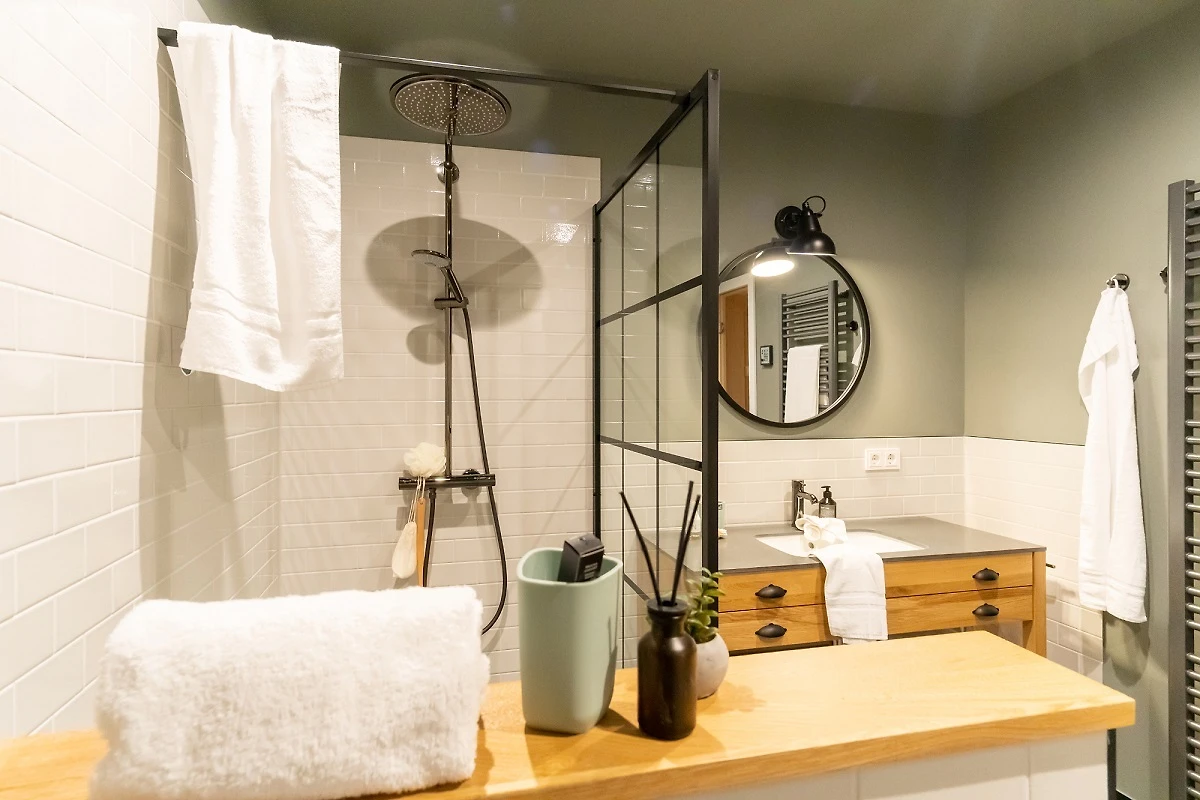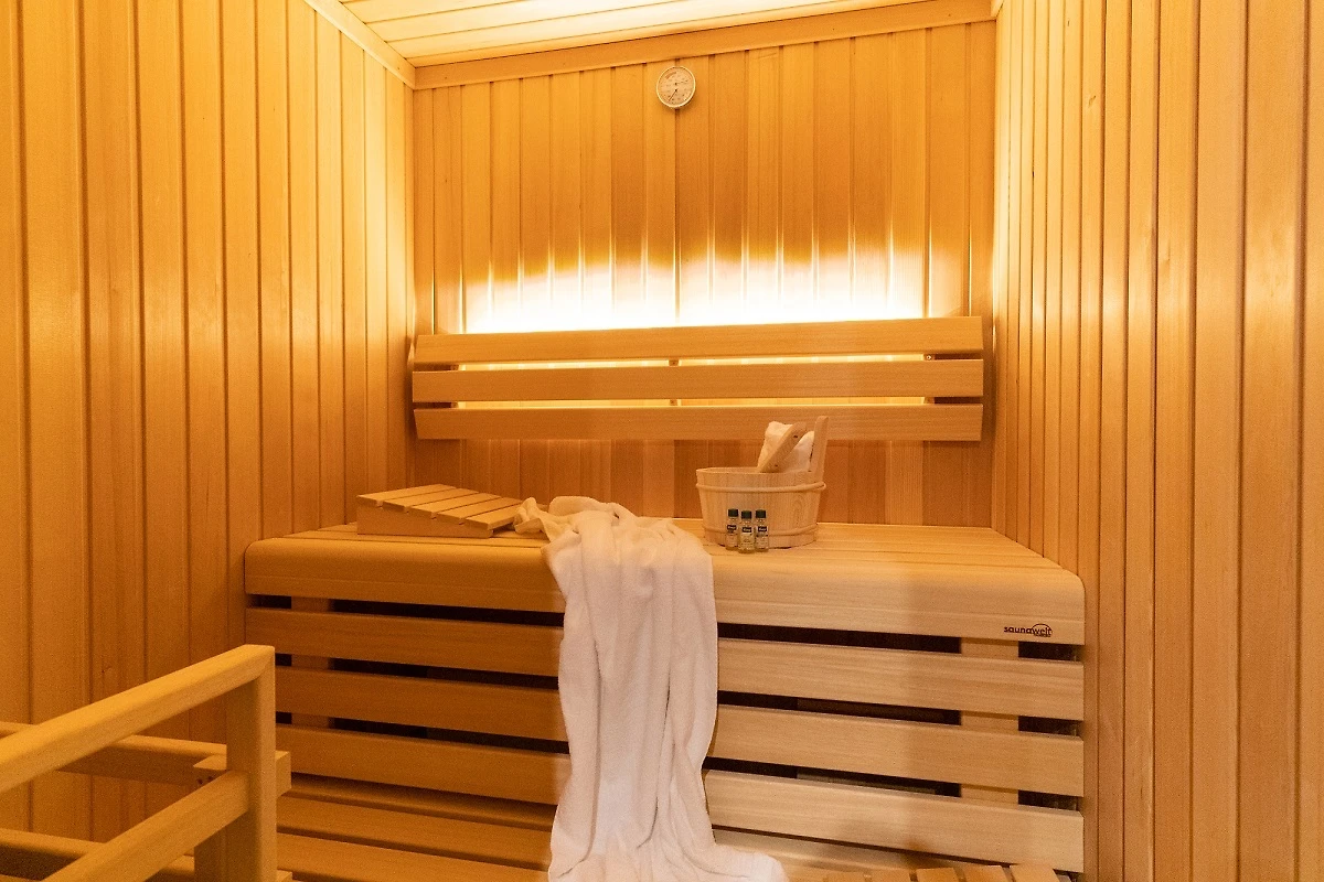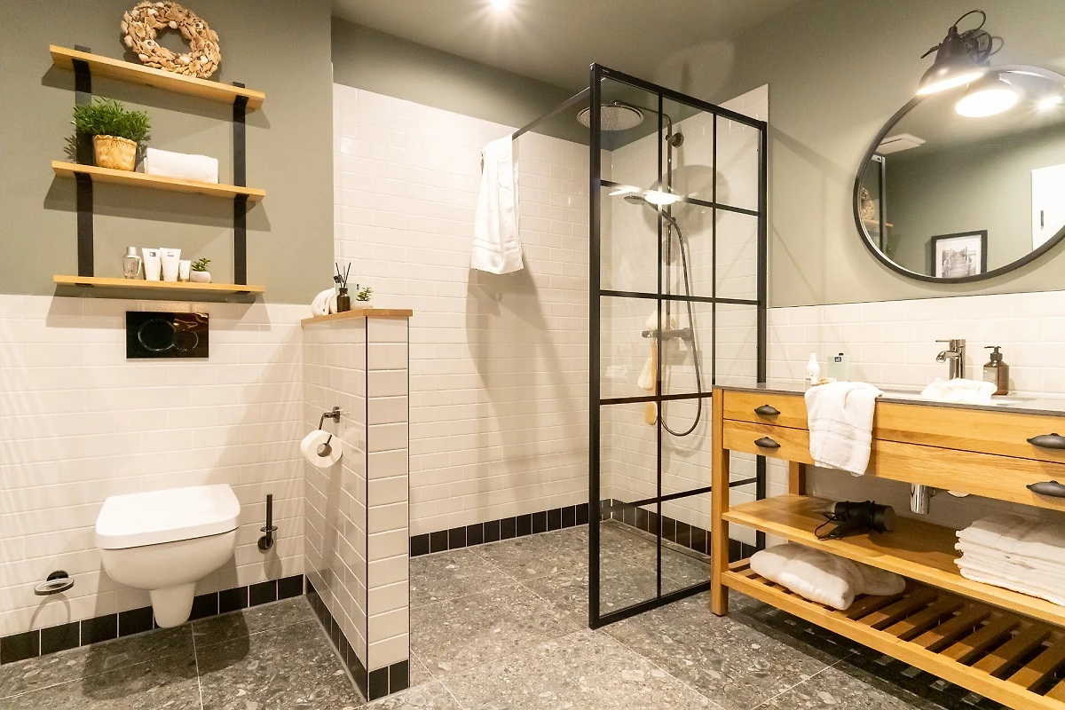 Im Badezimmer gibt es die grosszügig bemessene, ebenerdige Dusche, ein WC und den Waschtisch sowie die, durch eine Glastür getrennte, Sauna. Zusätzlich verfügt die Wohnung noch über ein separates Gäste-WC.