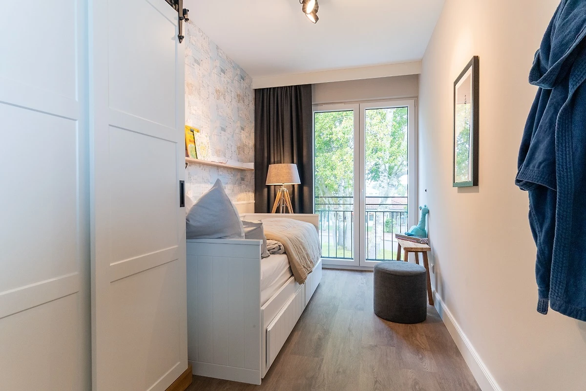 Eines der beiden Schlafzimmer ist mit einem Doppelbett, einem Kleiderschrank mit Hotelsafe und Verdunklungsvorhängen ausgestattet. Das zweite Schlafzimmer bietet ein zum Doppelbett ausziehbares Kojenbett, eine urige Holzbank, einen Kleiderschrank und Verdunklungsvorhänge.