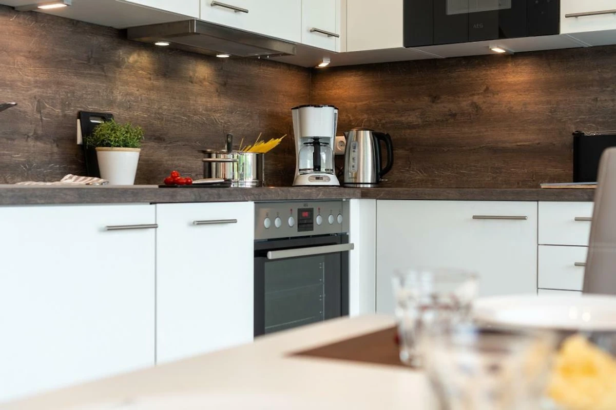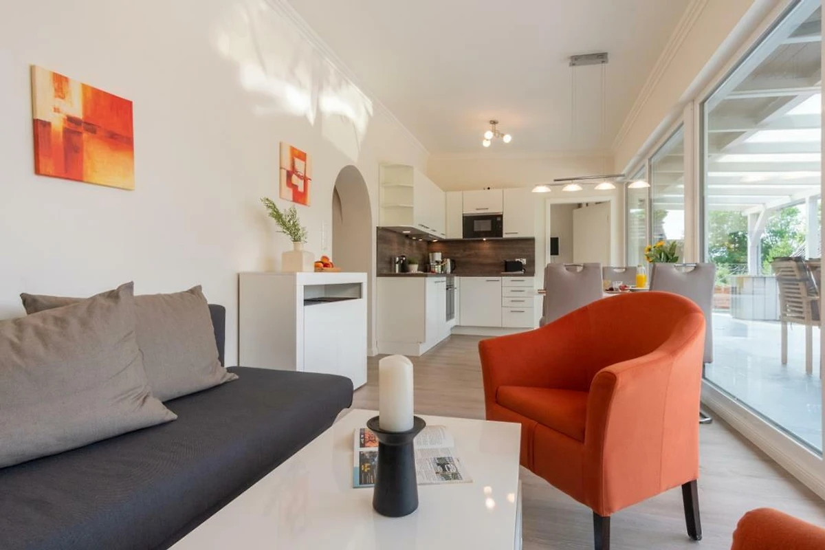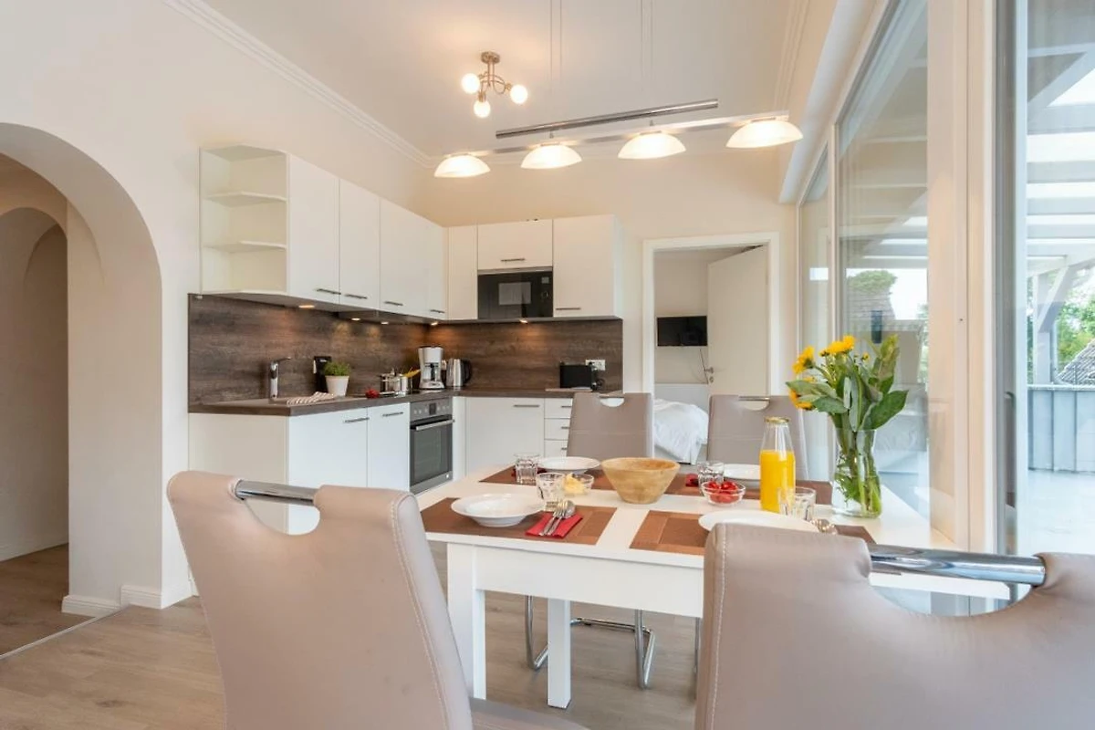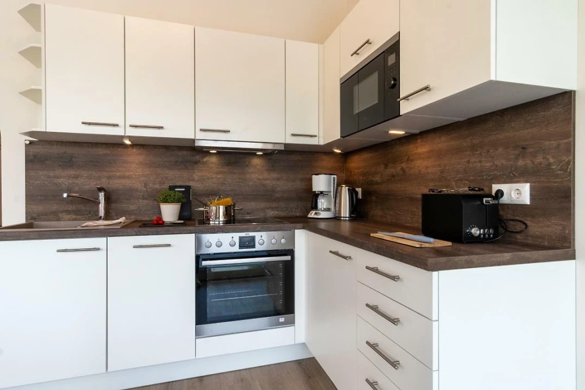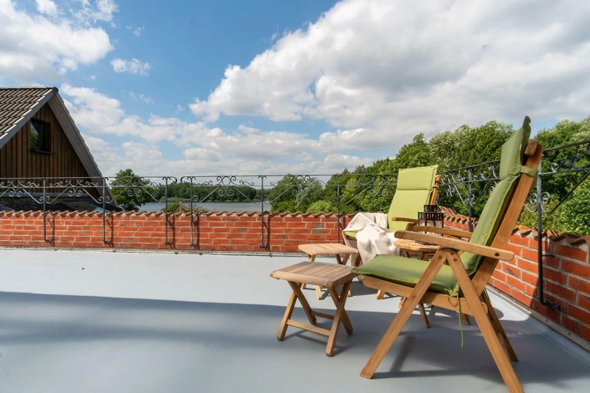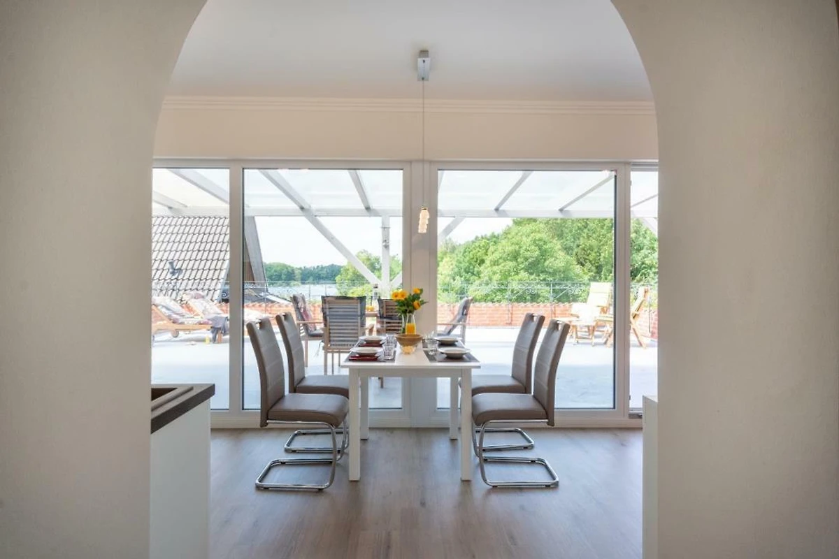 Willkommen im Haus "Schwanensee" am grossen Plöner See. Die frisch renovierte Ferienwohnung befindet sich im 1. Obergeschoss des Hauses und wurde liebevoll modernisiert. Im lichtdurchfluteten Wohnbereich erwartet Sie ein gemütliches Sofa, ein Flatscreen-TV, sowie eine kleine Essecke direkt am Terrassenfenster. Direkt daneben befindet sich der Zugang zur grossen Dachterrasse mit direktem Blick zum Bischofsee. Die offene Küchenzeile ist komplett eingerichtet. Besteck, Essgeschirr, Töpfe und Pfannen sind ausreichend vorhanden. Ausserdem steht Ihnen neben einer Kaffeemaschine, einem Wasserkocher und einem Toaster auch noch eine Geschirrspüler zur Verfügung. Das angrenzende geräumige Duschbad verfügt über ein WC, ein Waschbecken mit grossem Spiegel, sowie eine Dusche mit Glaskabine.