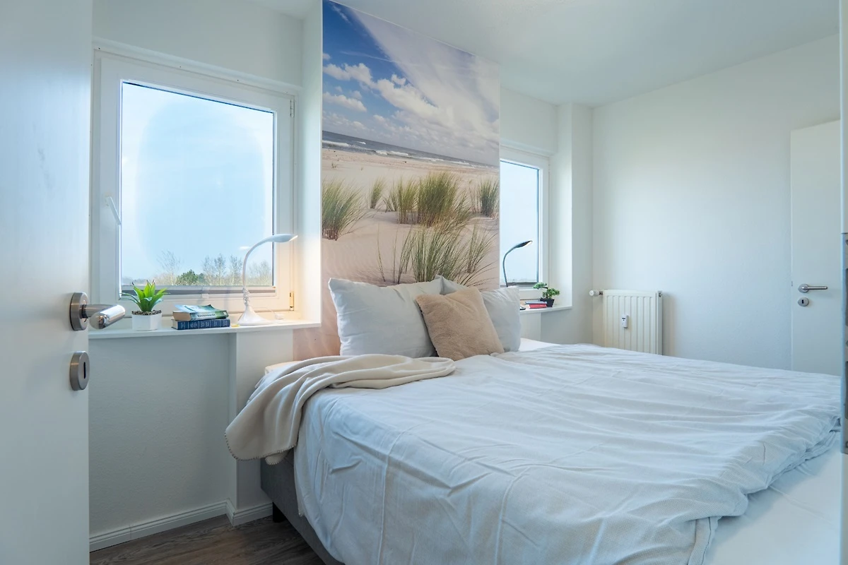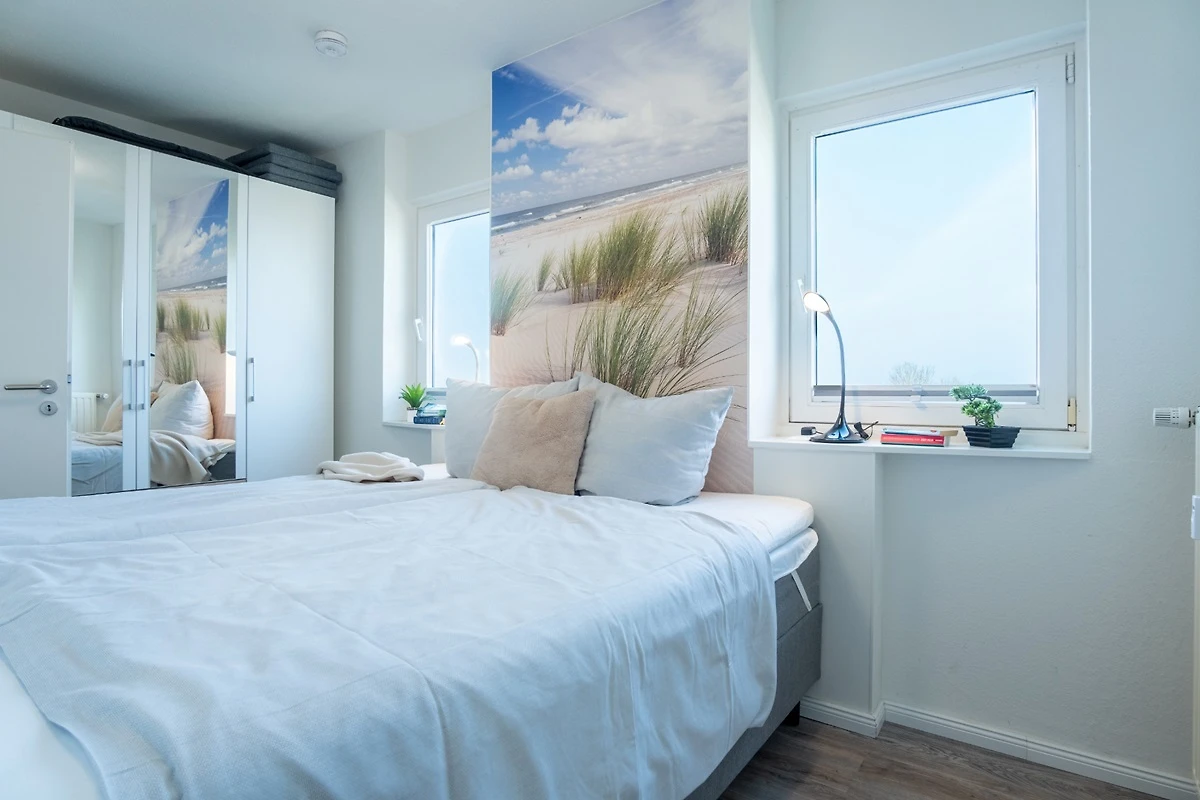 Im Schlafzimmer finden Sie ein bequemes Boxspringbett (ca. 180x200 cm), ein Flatscreen-TV und einen grossen Kleiderschrank mit Spiegel. Zwei Fenster mit Ausblick auf die Fehmarnsundbrücke.