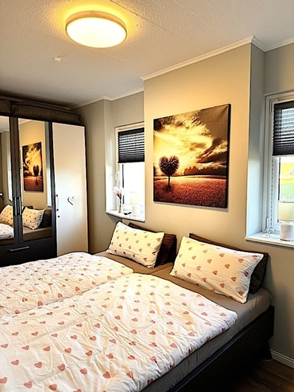 Das helle Schlafzimmer ist bequem durch zwei Schiebetüren zu erreichen und bietet Platz für den geräumigen Schrank und das grosse Doppelbett.