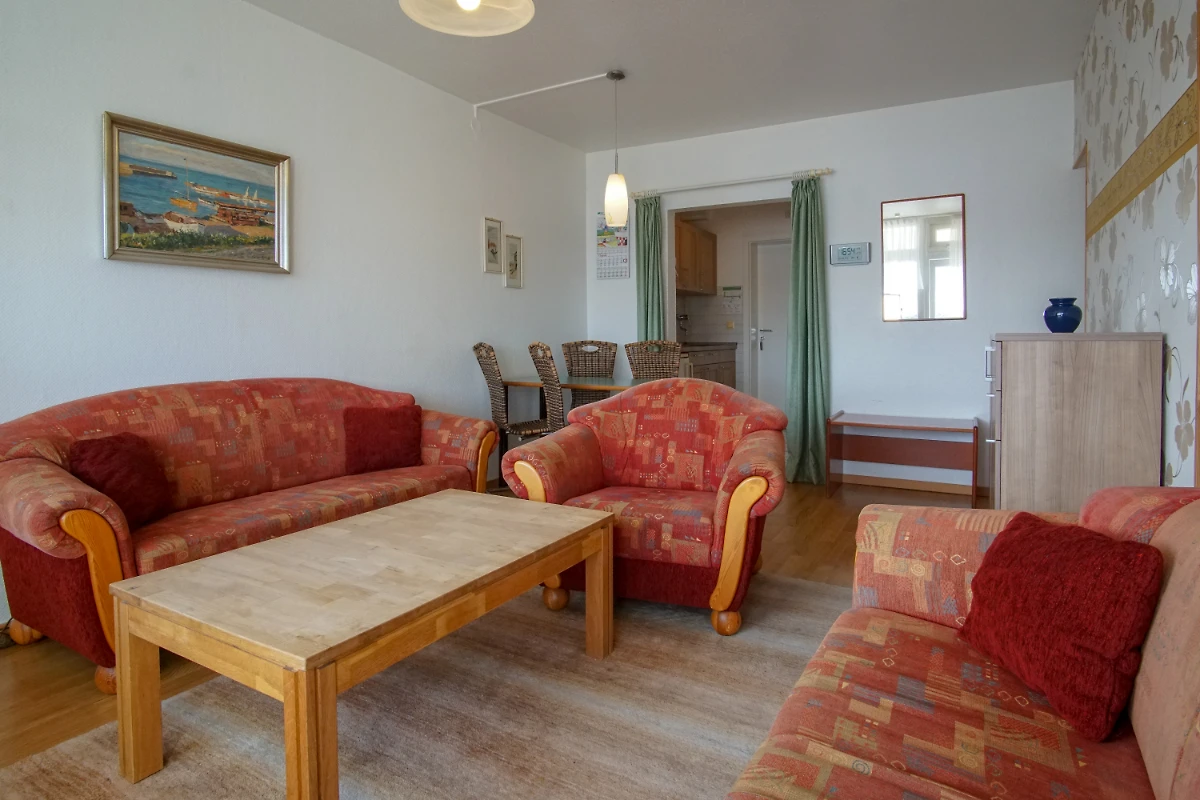 Urlauben Sie auf grosszügigen 44 m² (2. Etage) im "Strandhuus" auf dem Steinwarder - nur wenige Meter vom Badestrand entfernt. Die gemütlich-rustikale Ferienwohnung verfügt über einen sonnigen Wohnbereich mit Sofa, Sessel und Flatscreen-TV. Im Essbereich finden bequem vier Personen Platz. Im abgetrennten Schlafbereich befindet sich ein Doppelbett. Das Kinderzimmer ist mit einem Etagenbett eingerichtet - ideal für zwei Kinder oder Teenager. Der offene Küchenbereich ist für den Urlaubsbedarf voll ausgestattet. Vom Wohnzimmer aus haben Sie einen tollen Blick auf den Binnensee.