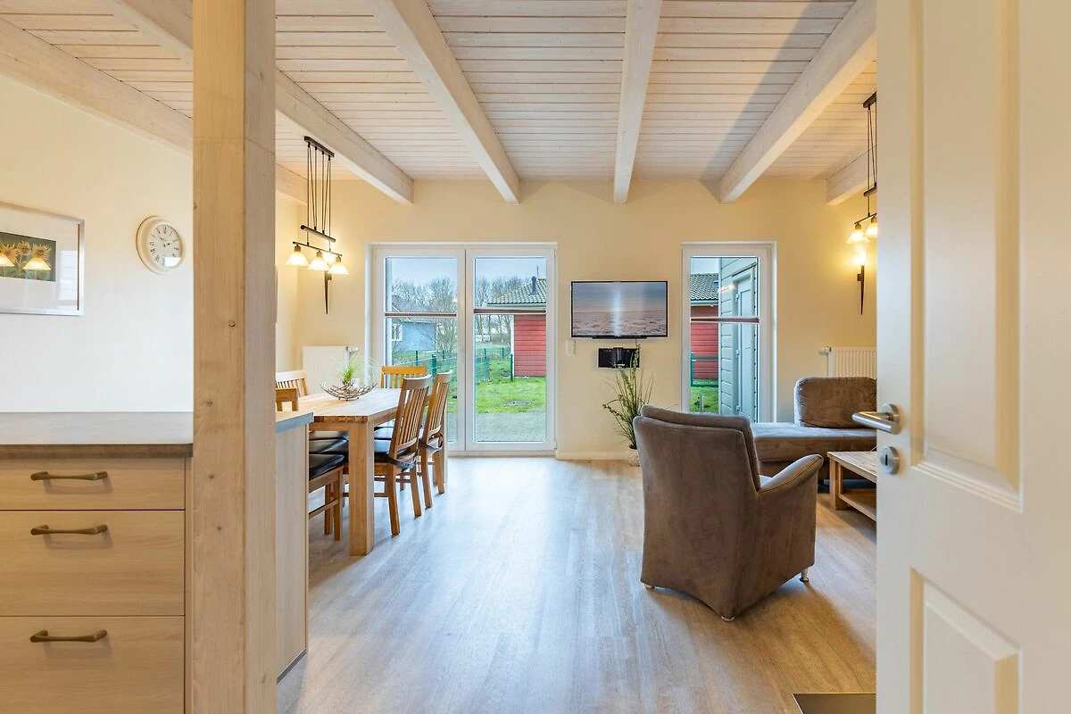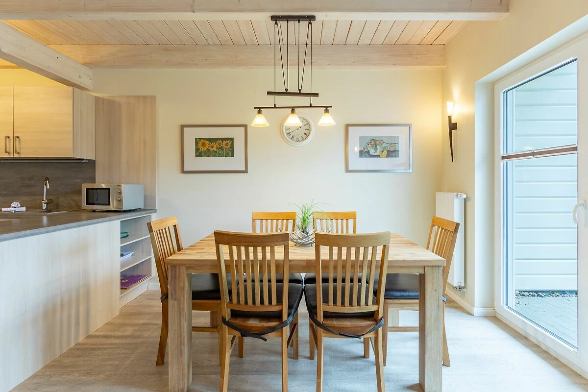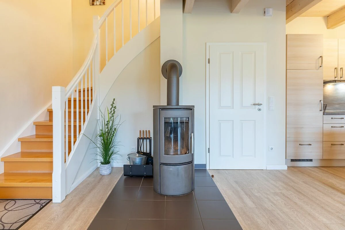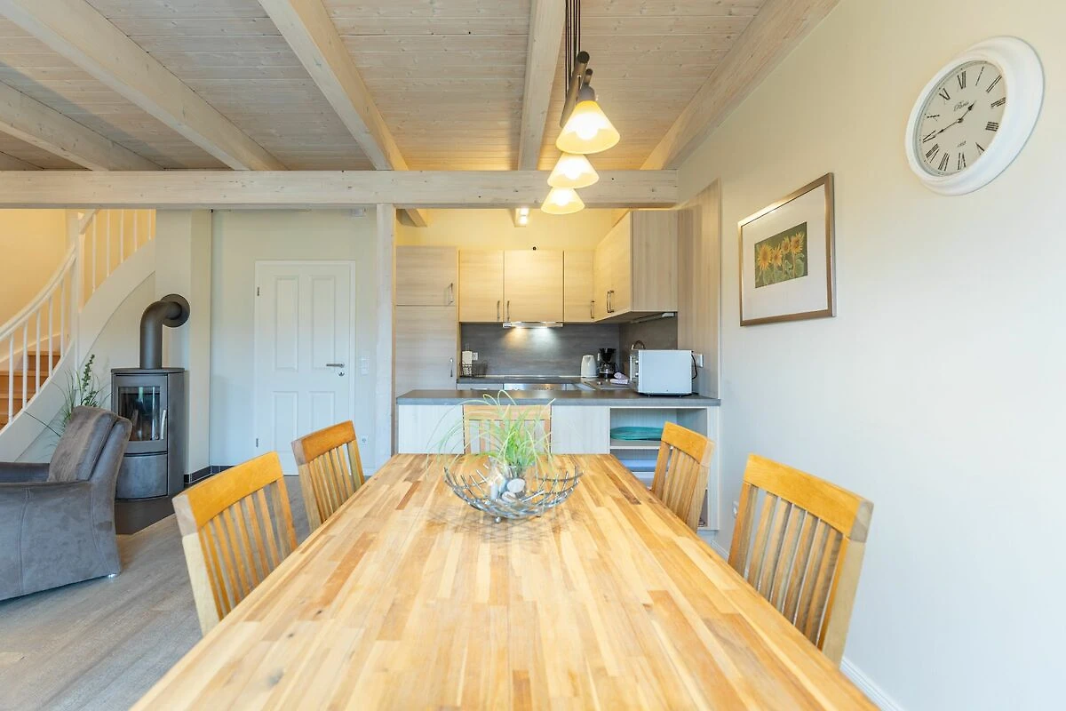 Das 100 qm große Ferienhaus ist modern und exklusiv im skandinavischen Charme eingerichtet. Zwei Schlafzimmer sind mit jeweils einem Komfort-Doppelbett (180 × 200 cm) ausgestattet, ein Schlafzimmer im Erdgeschoss bietet Ihnen ein Eck-Etagenbett, sodass Sie insgesamt für bis zu sechs Personen Platz finden. Das gemütliche Wohnzimmer ist mit SAT‑TV und Musikanlage ausgestattet. Der Kaminofen sorgt in der kälteren Jahreszeit für behagliche Stunden. Die offene Küche bietet Ihnen eine exklusive und umfangreiche Ausstattung, die das Herz eines jeden Hobbykochs höher schlagen lässt: Ceranfeld mit 4 Kochplatten, Backofen, Kühlschrank mit ***Gefrierfach, Mikrowelle, Geschirrspüler, Filterkaffeemaschine, Toaster und Wasserkocher. Das Badezimmer im Obergeschoss lässt keine Wünsche offen: Zwei Waschbecken, eine große Badewanne, eine ebenerdige Dusche und eine schöne Sauna geben Ihrem Urlaub den richtigen Rahmen. Im Erdgeschoss steht Ihnen zusätzlich noch ein Duschbad zur Verfügung. Auf der Terrasse können Sie auf bequemen Gartenstühlen die Sonne genießen.