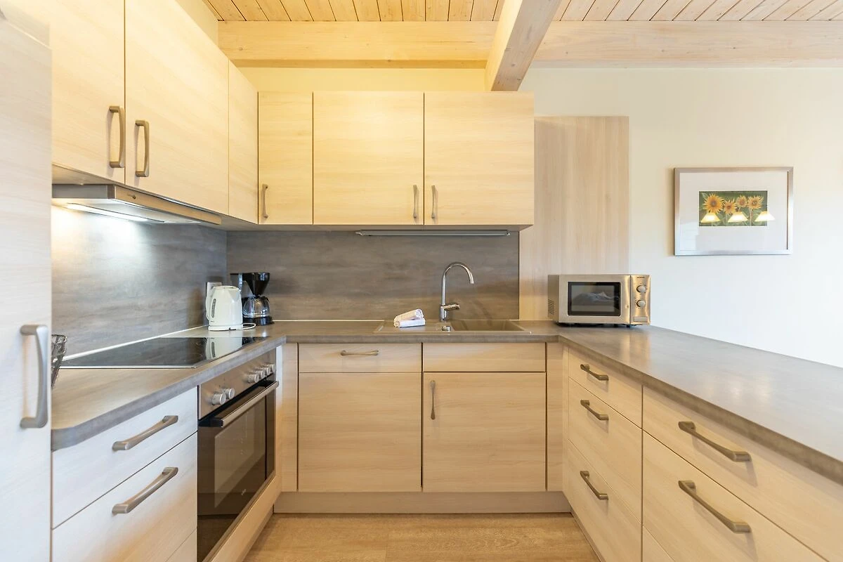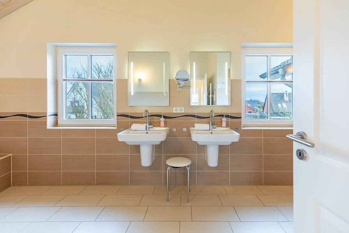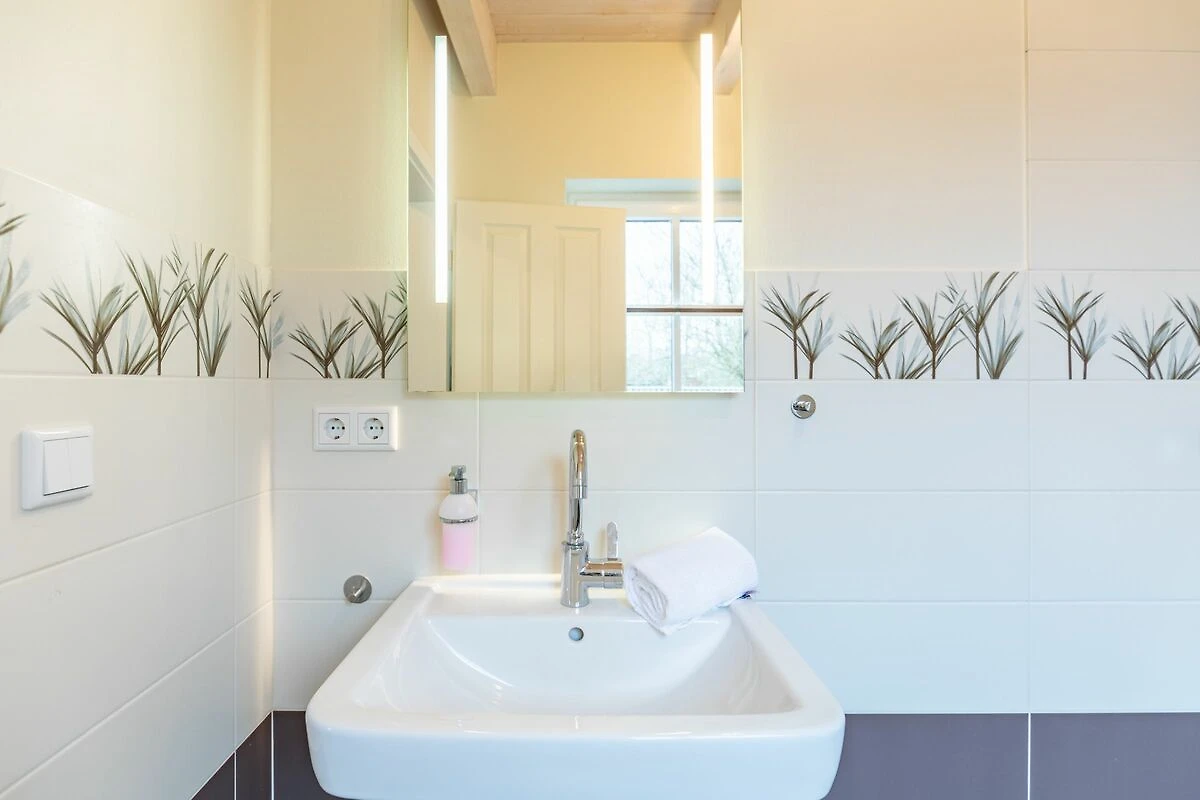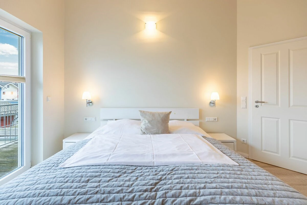 Das 100 qm große Ferienhaus ist modern und exklusiv im skandinavischen Charme eingerichtet. Zwei Schlafzimmer sind mit jeweils einem Komfort-Doppelbett (180 × 200 cm) ausgestattet, ein Schlafzimmer im Erdgeschoss bietet Ihnen ein Eck-Etagenbett, sodass Sie insgesamt für bis zu sechs Personen Platz finden. Das gemütliche Wohnzimmer ist mit SAT‑TV und Musikanlage ausgestattet. Der Kaminofen sorgt in der kälteren Jahreszeit für behagliche Stunden. Die offene Küche bietet Ihnen eine exklusive und umfangreiche Ausstattung, die das Herz eines jeden Hobbykochs höher schlagen lässt: Ceranfeld mit 4 Kochplatten, Backofen, Kühlschrank mit ***Gefrierfach, Mikrowelle, Geschirrspüler, Filterkaffeemaschine, Toaster und Wasserkocher. Das Badezimmer im Obergeschoss lässt keine Wünsche offen: Zwei Waschbecken, eine große Badewanne, eine ebenerdige Dusche und eine schöne Sauna geben Ihrem Urlaub den richtigen Rahmen. Im Erdgeschoss steht Ihnen zusätzlich noch ein Duschbad zur Verfügung. Auf der Terrasse können Sie auf bequemen Gartenstühlen die Sonne genießen.
