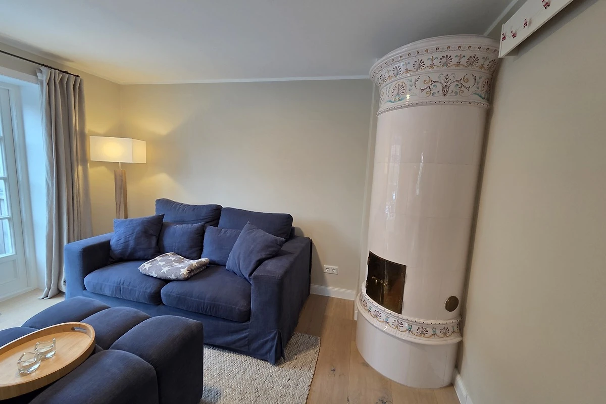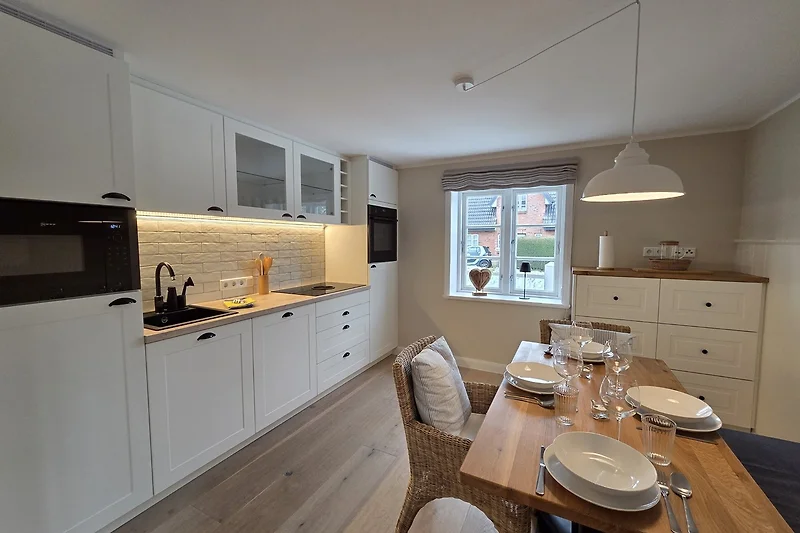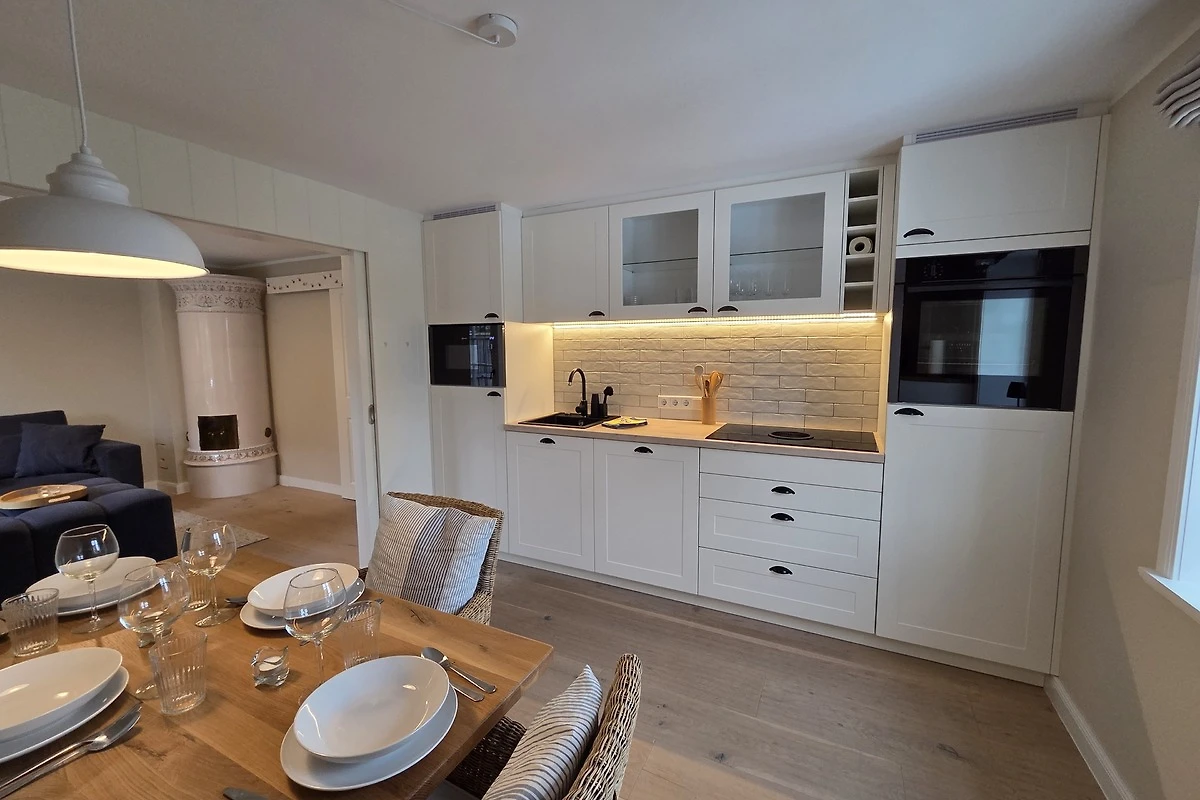 Der gemütliche Wohnbereich lädt mit Sofa, Kaminofen, Sat-Flat-TV und grossem Esstisch zu entspannten Stunden ein. Die separate Küche ist voll ausgestattet und verfügt unter anderem über Backofen, Cerankochfeld, Geschirrspülmaschine, Mikrowelle, Kühlschrank mit Gefrierfach, Kaffeemaschine, Wasserkocher und Toaster – ideal für die Selbstversorgung im Urlaub.
