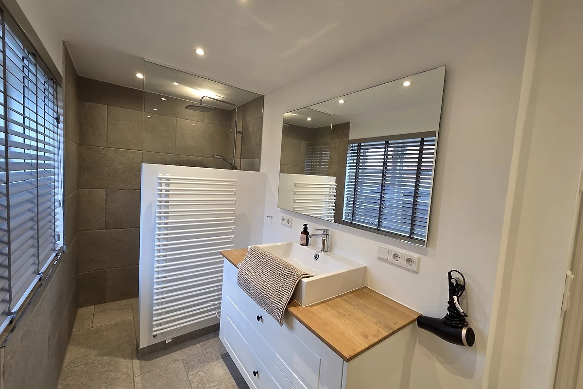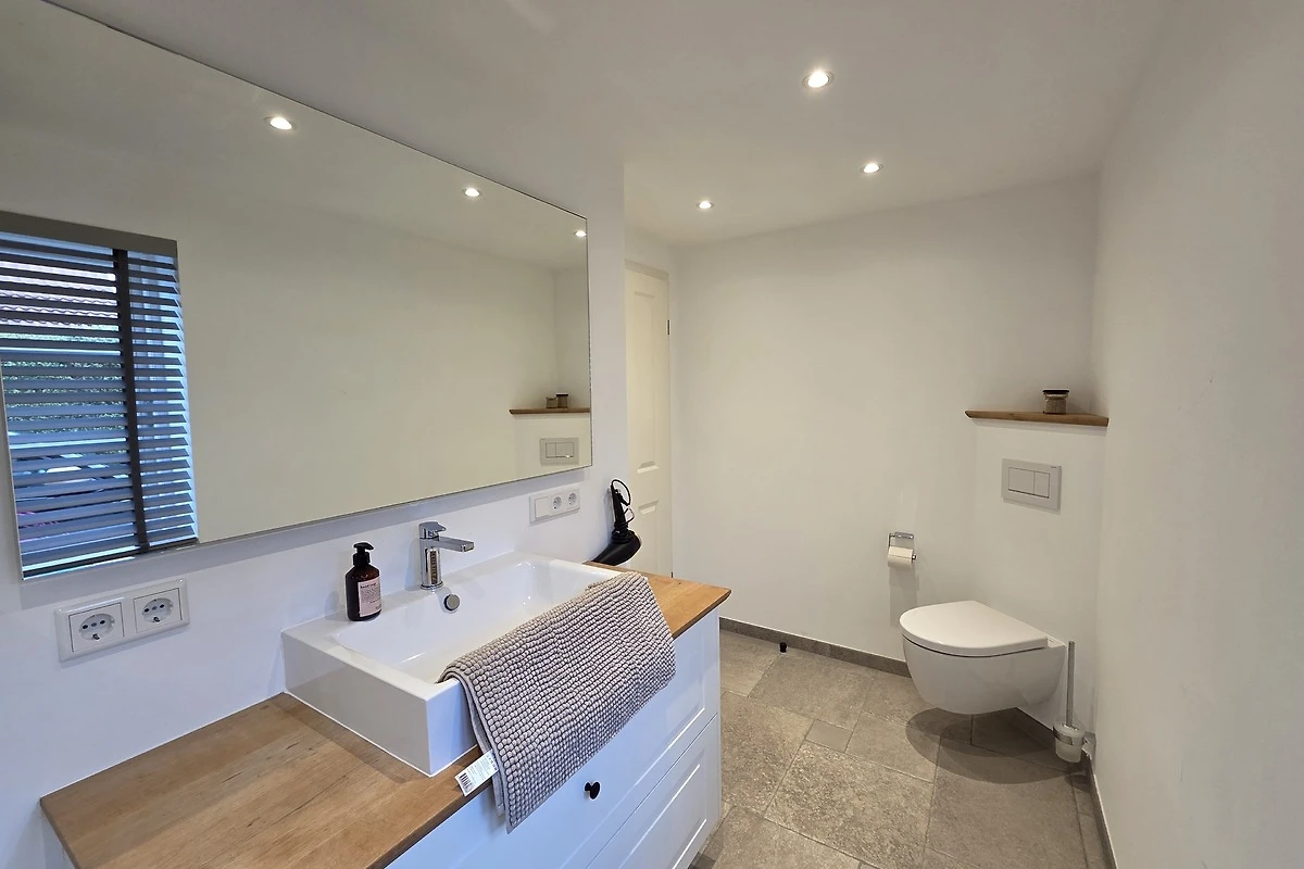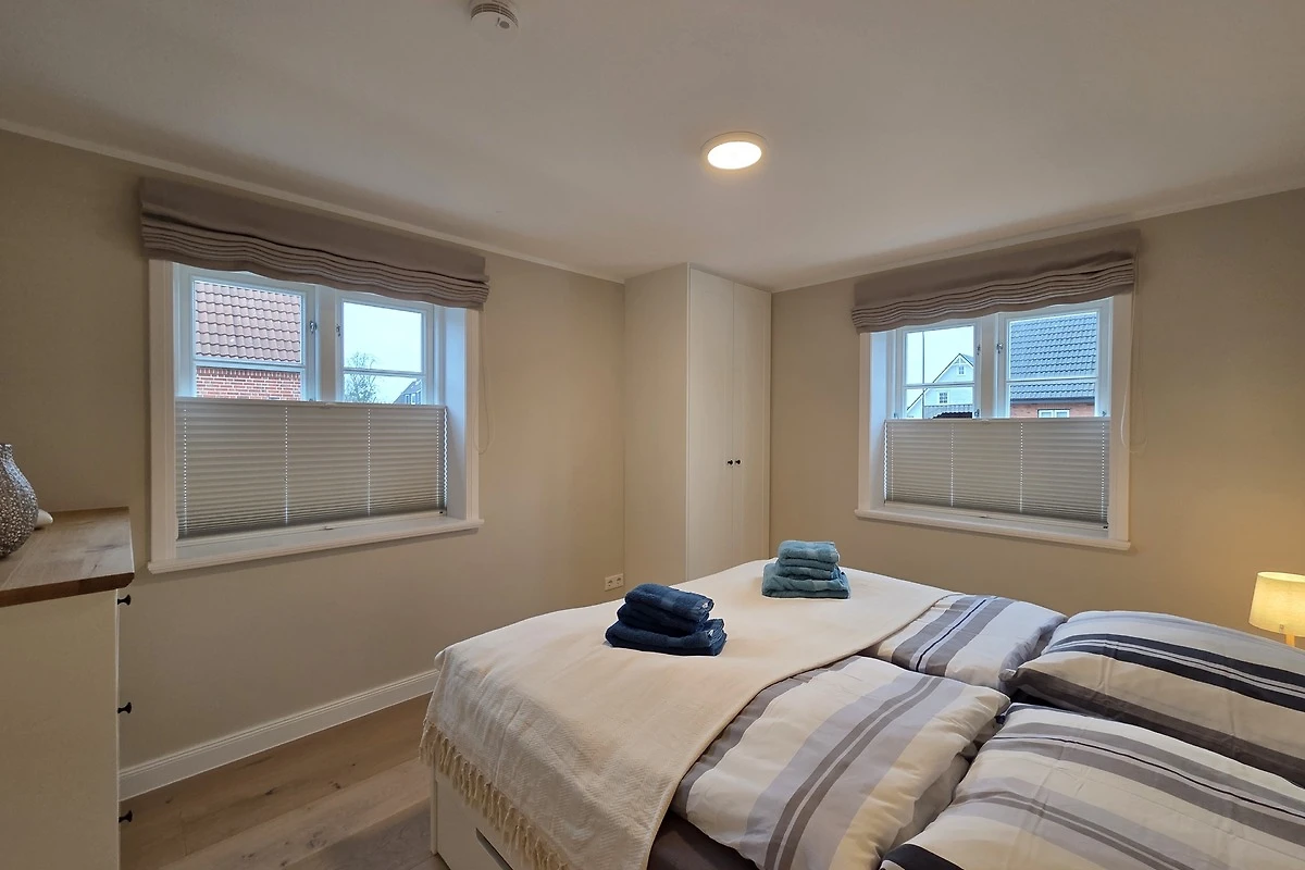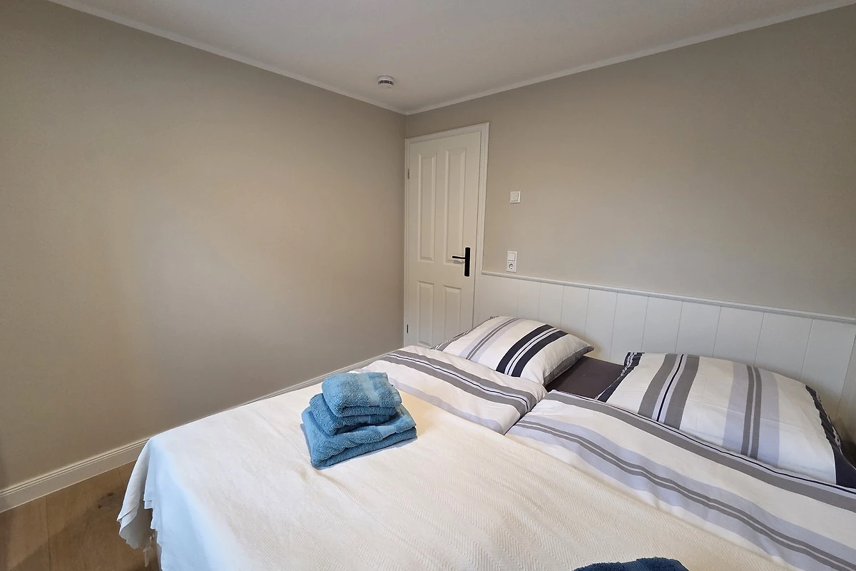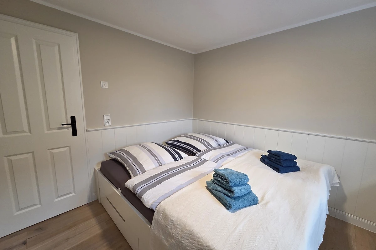 Die Ferienwohnung verfügt über zwei Schlafzimmer, jeweils mit komfortablem Doppelbett (180 × 200 cm) und Kleiderschrank, die für erholsamen Schlaf sorgen. Das moderne Bad mit Dusche/WC ist funktional ausgestattet, zusätzlich stehen Haartrockner sowie Waschmaschine und Trockner zur Verfügung.