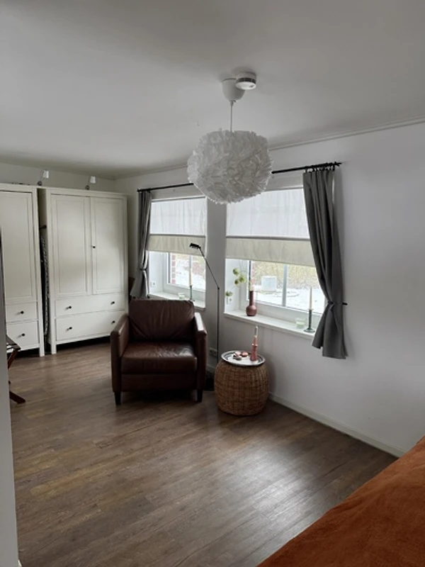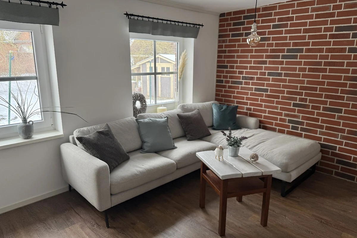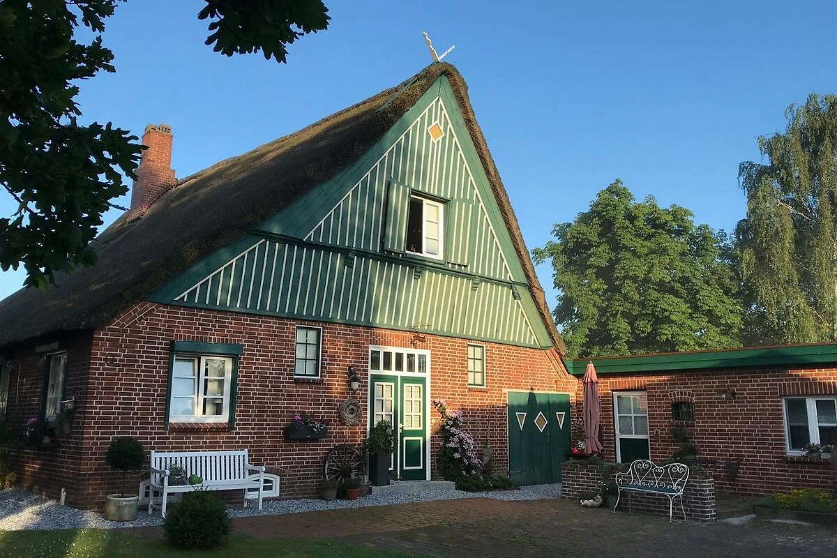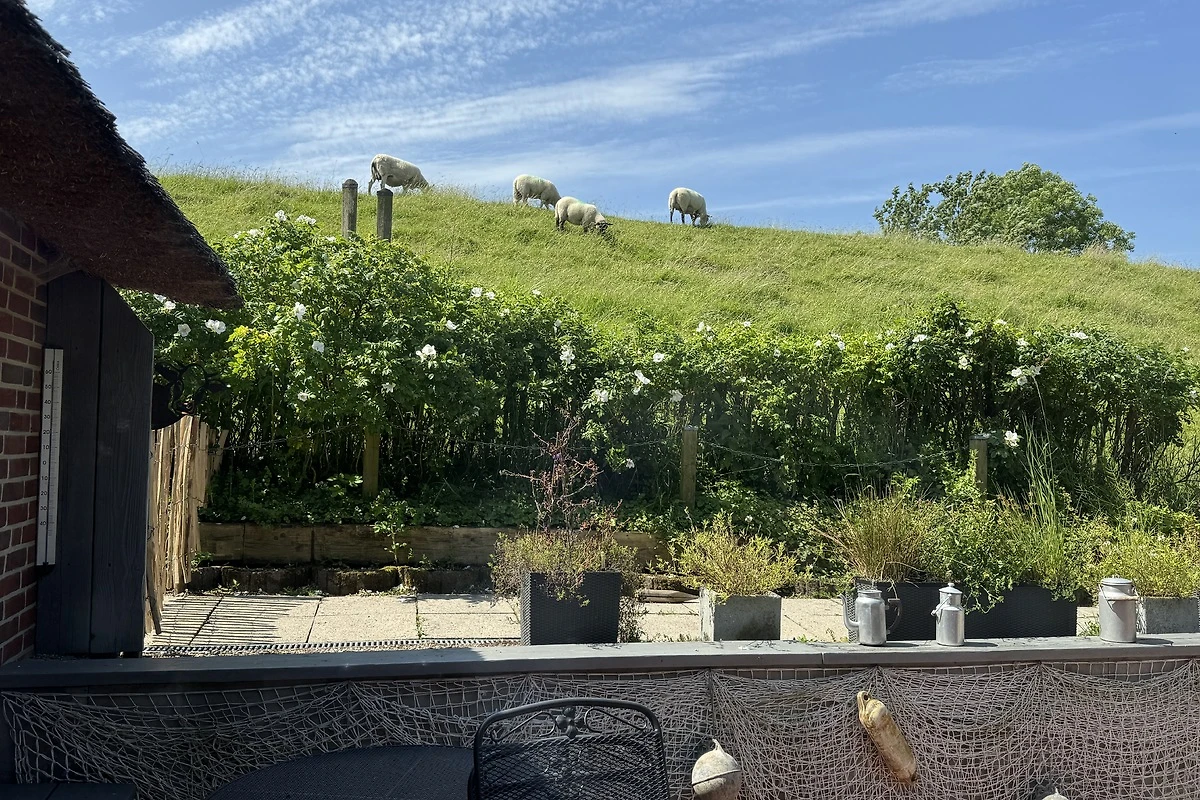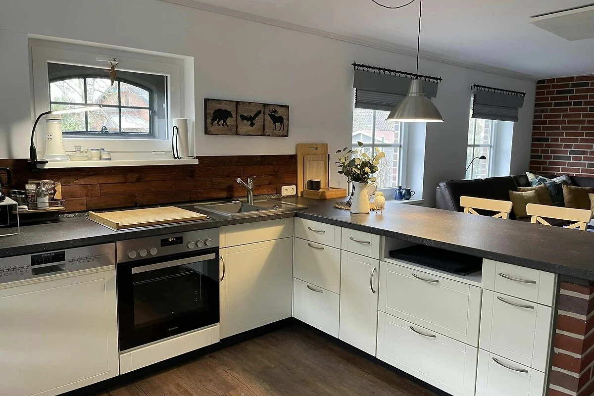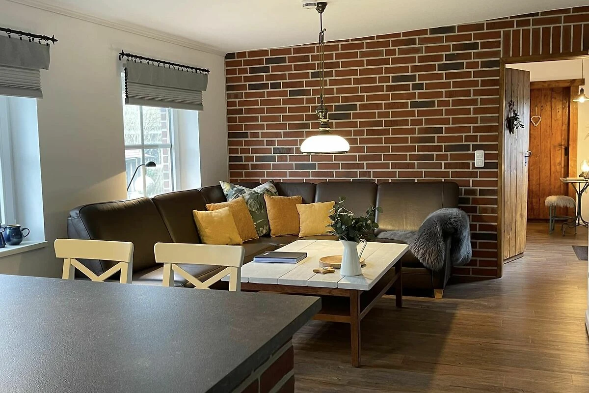 Die Wohnung befindet sich in einem liebevoll restaurierten Reetdachhof-Ensemble von 1724, das heute von einer Familie mit Kindern bewohnt wird – ein lebendiger Ort mit Herz, der gleichzeitig viel Raum für Ruhe und Erholung bietet.