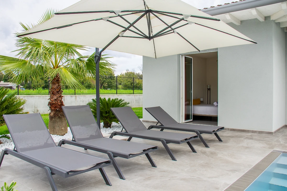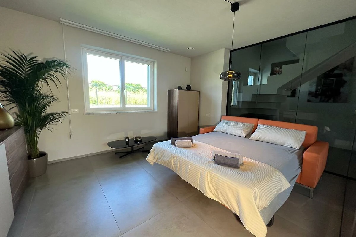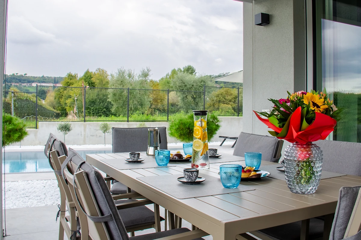Willkommen in der Villa La Torre in Puegnago del Garda – Ihr ideales Ferienhaus am Gardasee! Auf großzügigen 160 m² bietet dieses stilvolle Domizil Platz für bis zu 6 Gäste und sorgt mit drei Schlafzimmern, 2 x 2m breite Betten, alle 3 Betten mit Topper, und zwei modernen Bädern mit Walk-In Duschen für höchsten Komfort. Nach einem erlebnisreichen Tag entspannen Sie sich am hauseigenen Swimmingpool oder genießen laue Abende auf der Terrasse. Die voll ausgestattete Küche lässt keine Wünsche offen: Hier finden Sie eine Spülmaschine, Mikrowelle, Wasserkocher und Kaffeemaschine – perfekt für gesellige Kochabende. Der lichtdurchflutete Essbereich lädt zum Verweilen ein, während der Wohnbereich mit TV für Unterhaltung sorgt. Für angenehme Temperaturen steht eine Klimaanlage zur Verfügung. Praktische Annehmlichkeiten wie Waschmaschine, Bügeleisen und Haartrockner machen den Aufenthalt besonders bequem. Die Villa verfügt zudem über eine Garage für Ihr Auto oder ihr Motorrad. Sie ist ausschließlich für Nichtraucher geeignet und bietet eine allergenarme Umgebung mit Salzwasserpool, Hausfilteranlage und mit UV-Filter und Ozonfilteranlage, auch für Asthmatiker geeignet – ideal für Gäste mit besonderen Ansprüchen. Was Allergiker betrifft: das Bett im Turmschlafzimmer ist nur aus Holzteilen konstruiert, ohne Eisenschrauben. Auch ein längerer Aufenthalt ist möglich. Auf der sonnigen Terrasse mit bequemen Liegen und Blick in die Weinberge und auf die zahlreichen Burgen auf den Moränenhügeln des Gardasees erleben Sie die entspannte Atmosphäre des Gardasees hautnah. Das Haus ist vom Feinsten und eine optimale Wahl in jeder Beziehung, sei es bezüglich der Gegend oder des Wohnkomforts. Das ist die richtige Formel für gelungene Ferien.