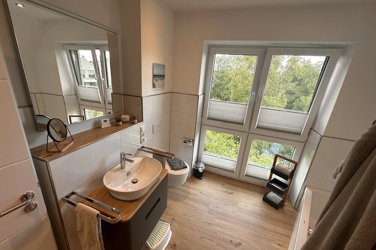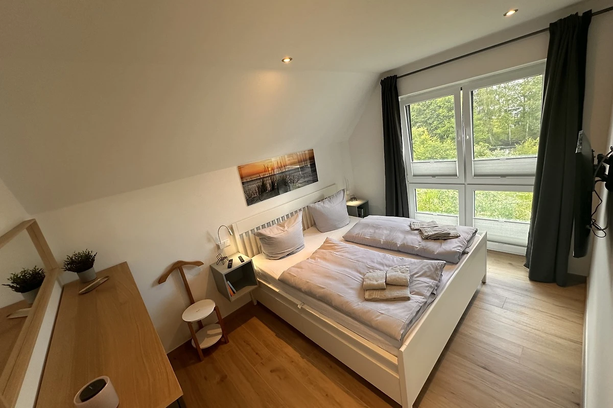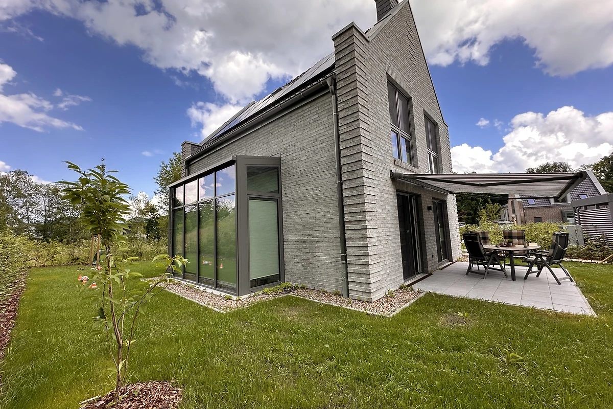 Das freistehende Ferienhaus bietet auf 115 m² großzügigen Platz für bis zu 6 Personen. Drei Schlafzimmer, zwei Bäder und ein helles Wohnzimmer mit bodentiefen Fenstern sorgen für Wohlfühlatmosphäre – auch bei Schietwetter.