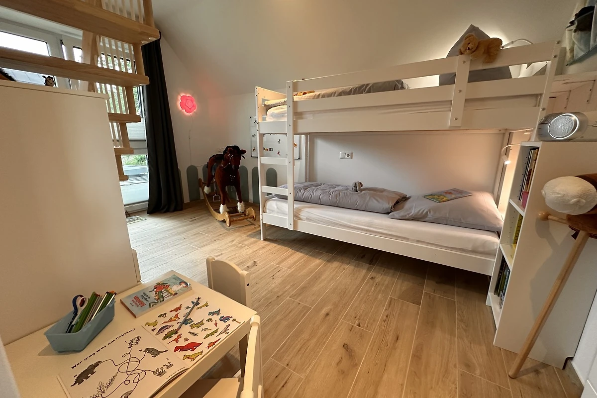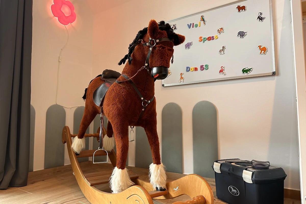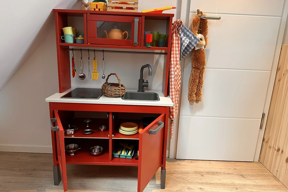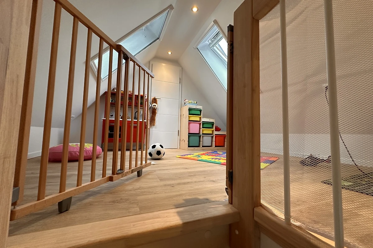 Das Highlight für Kinder: Ein eigenes Spielzimmer im Dachgeschoss mit riesiger Spielzeugauswahl. LEGO, Playmobil, Kinderküche, Verkleidungskiste, Bücher, Puzzle und Spiele für alle Altersgruppen. Während die Kinder oben spielen, entspannen die Eltern unten bei einem Glas Wein.