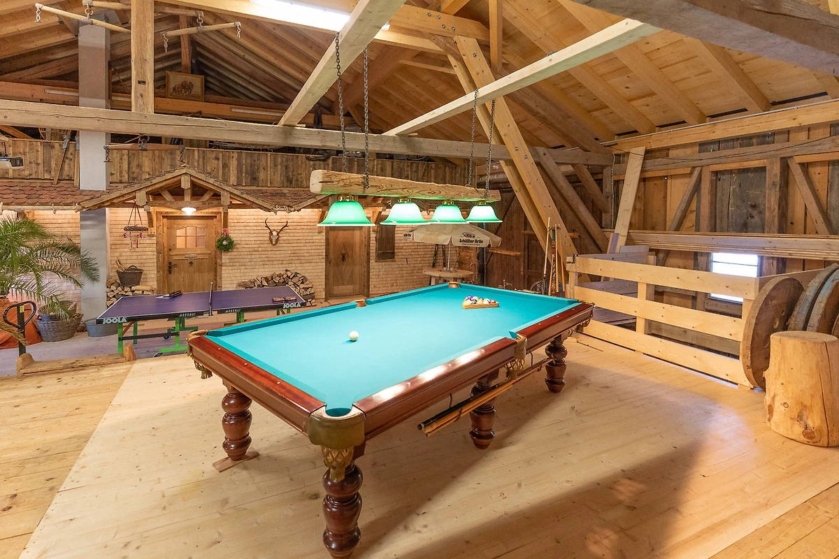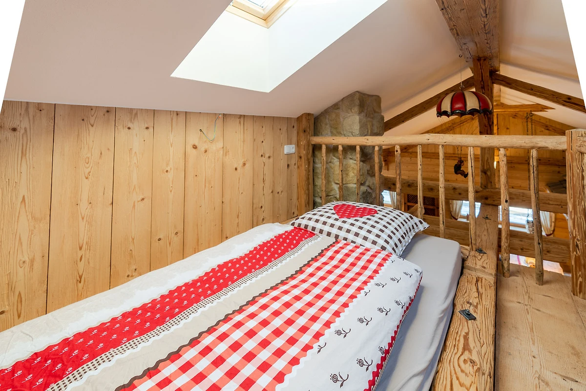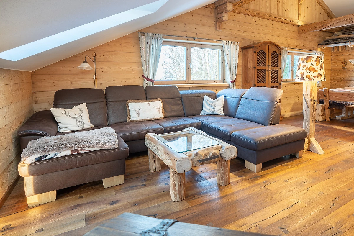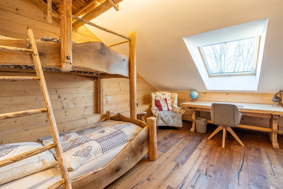 Die Ferienwohnung liegt im Dachgeschoss und hat ca.120m² Wohnfläche. Der besondere Hüttencharakter entsteht durch die rustikalen Schindeldächer, die das Schlafzimmerhüttle und das WC-Häusle schmücken. Im grossem Wohn- Essbereich mit Kaminofen können Sie die Ruhe und die Aussicht in die Natur geniessen. Zur Wohnung gehört ein Schlafzimmer mit Doppelbett, ein Schlafzimmer mit Stockbett sowie ein Bett auf der Empore. Zur Wohnung gehört die Nutzung der Scheune mit Billardtisch, Tischkicker, Tischtennisplatte und viel mehr.