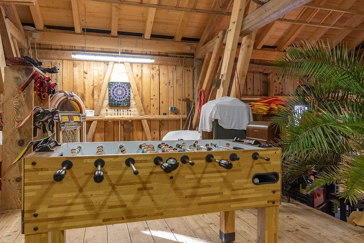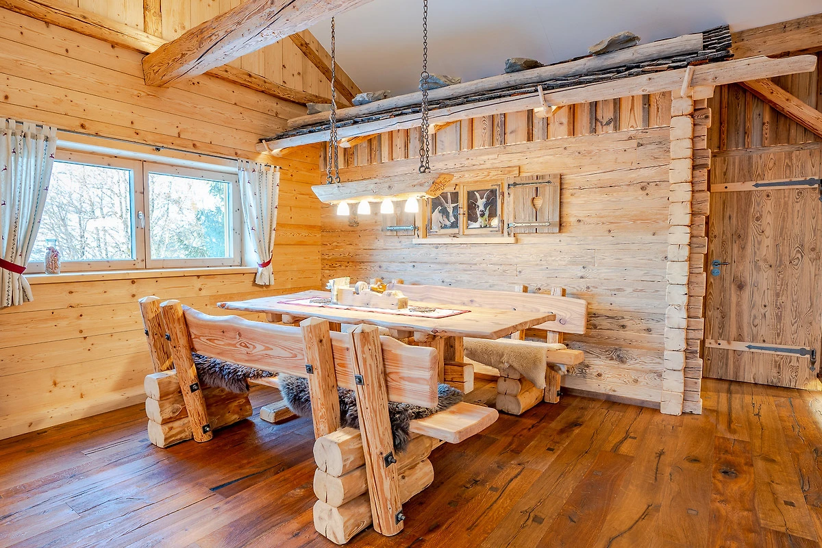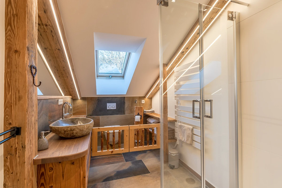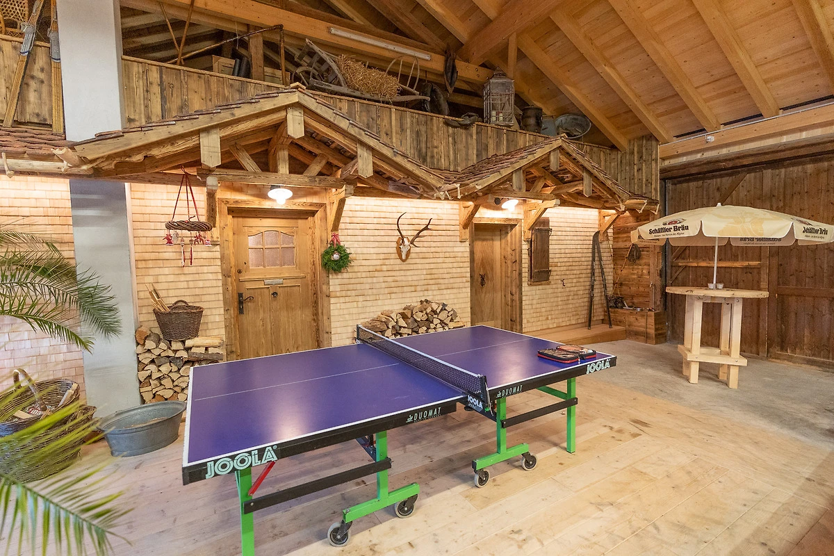 Die Ferienwohnung liegt im Dachgeschoss und hat ca.120m² Wohnfläche. Der besondere Hüttencharakter entsteht durch die rustikalen Schindeldächer, die das Schlafzimmerhüttle und das WC-Häusle schmücken. Im grossem Wohn- Essbereich mit Kaminofen können Sie die Ruhe und die Aussicht in die Natur geniessen. Zur Wohnung gehört ein Schlafzimmer mit Doppelbett, ein Schlafzimmer mit Stockbett sowie ein Bett auf der Empore. Zur Wohnung gehört die Nutzung der Scheune mit Billardtisch, Tischkicker, Tischtennisplatte und viel mehr.