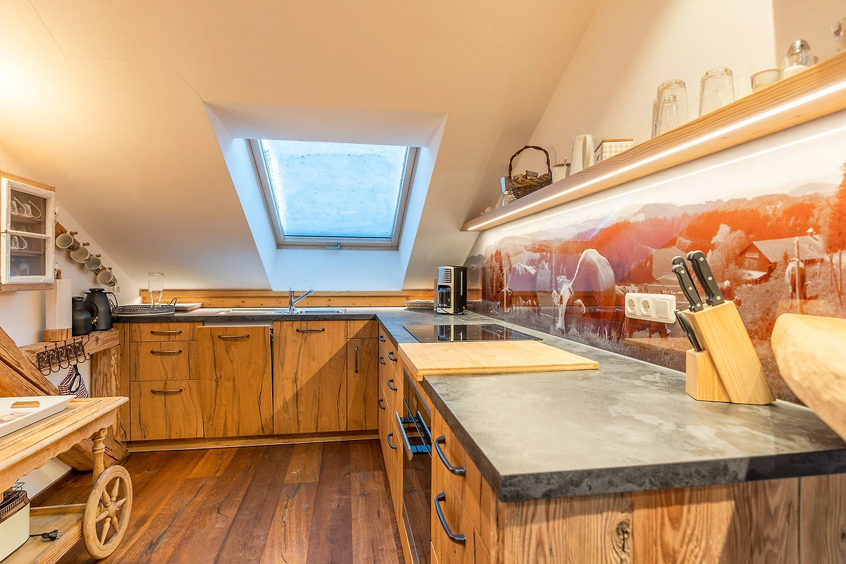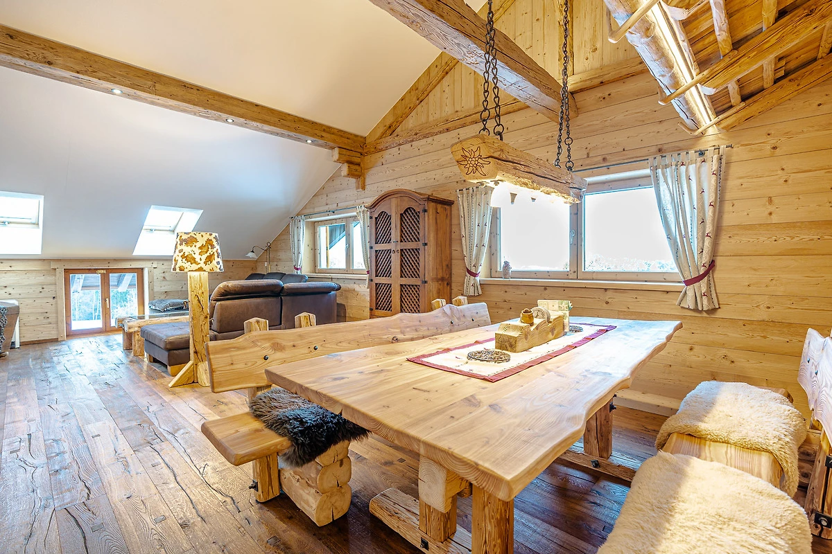 Ausgestattet ist sie mit einem hochwertigen Holzboden, Naturholzvertäfelungen an den Wänden und viele kleine Details die der Wohnung ihren gemütlichen Charme geben.