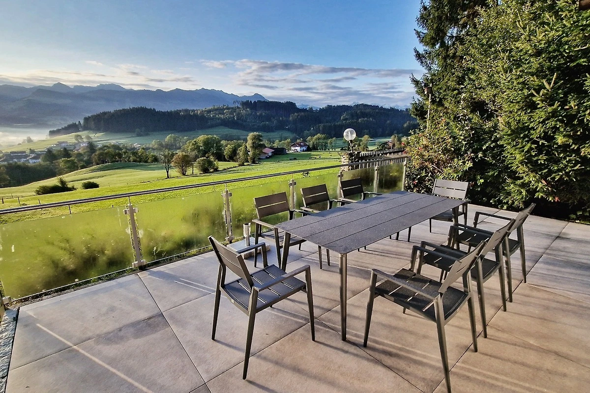 Ein absolutes Highlight ist die atemberaubende, rund 100 Quadratmeter grosse Terrasse. Hier eröffnet sich Ihnen ein traumhafter Blick auf die Allgäuer Berge. Geniessen Sie Ihr Frühstück unter freiem Himmel, lassen Sie sich von der Sonne wärmen oder erleben Sie unvergessliche Sonnenuntergänge. Um die Ruhe und Harmonie in der Nachbarschaft zu respektieren, sind Junggesellenabschiede und ähnliche Gruppenfeiern untersagt.