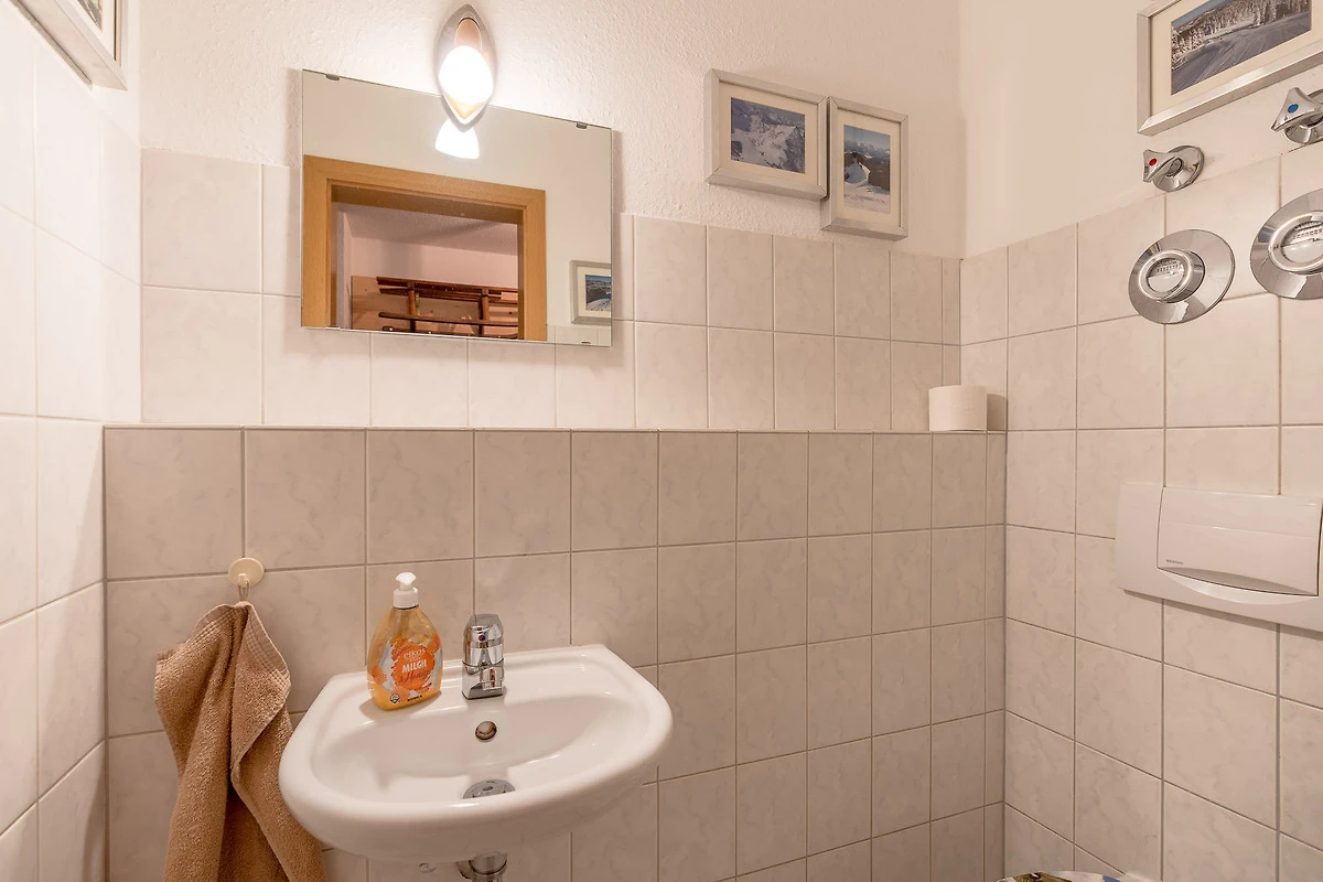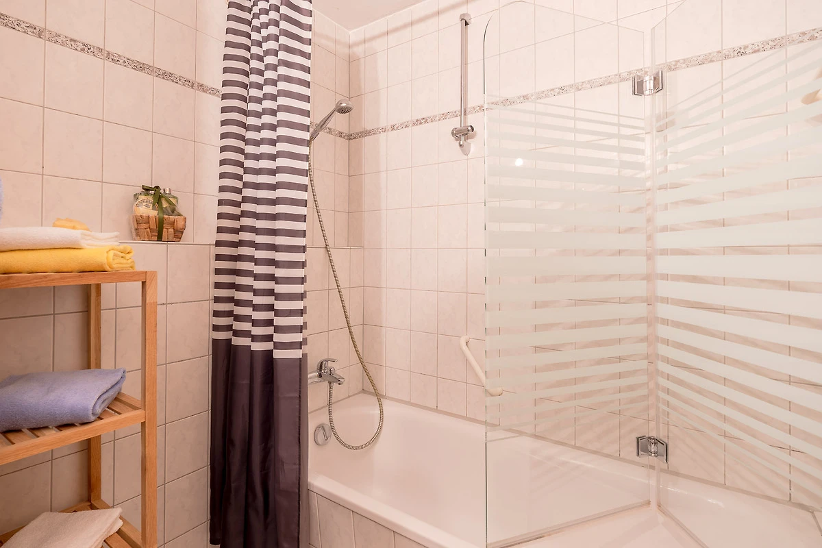 Das Badezimmer ist mit einer Badewanne inklusive Duschvorrichtung und Waschtisch ausgestattet. Die Wohnung verfügt über ein zusätzliches WC mit Waschtisch.