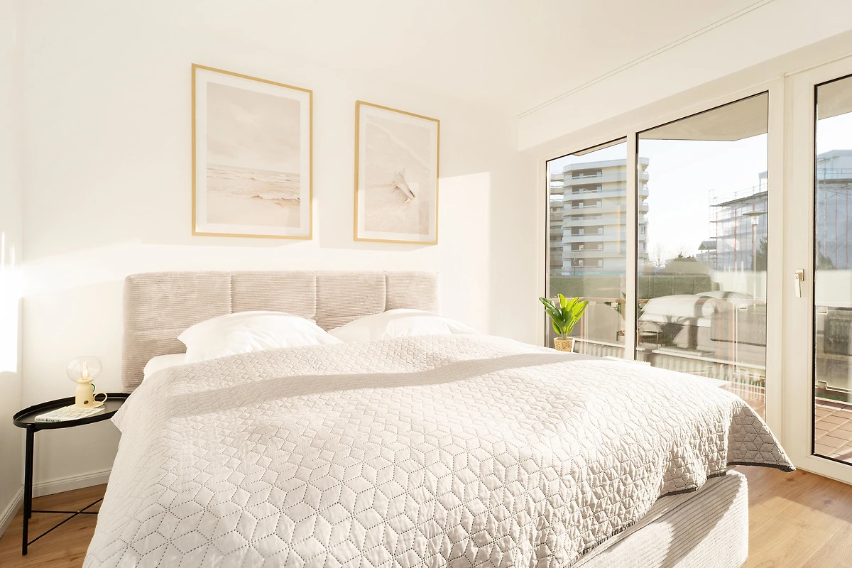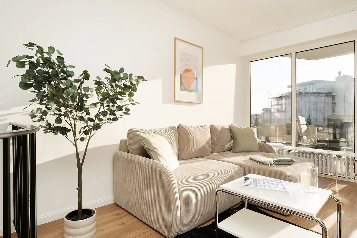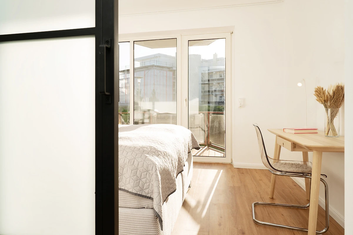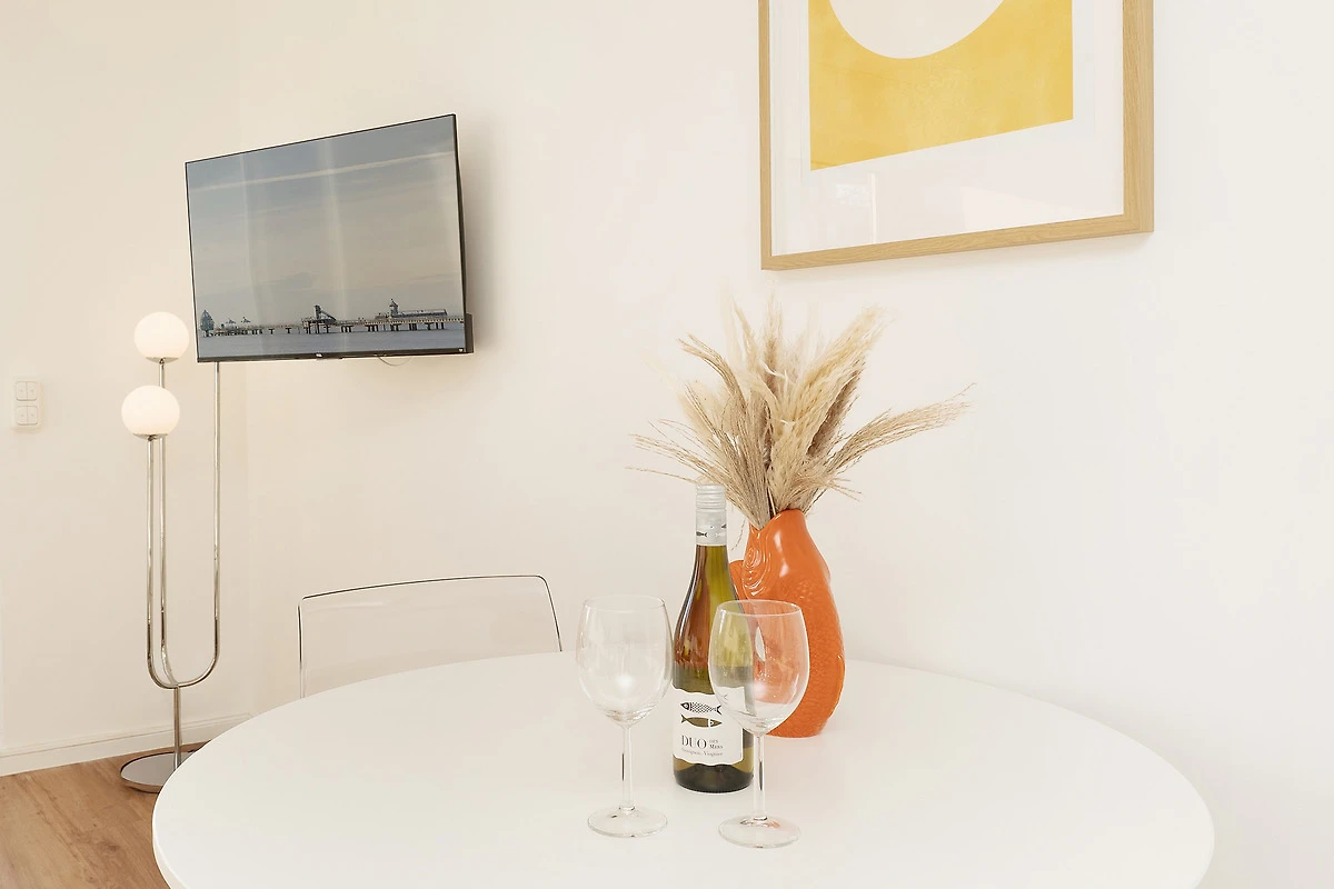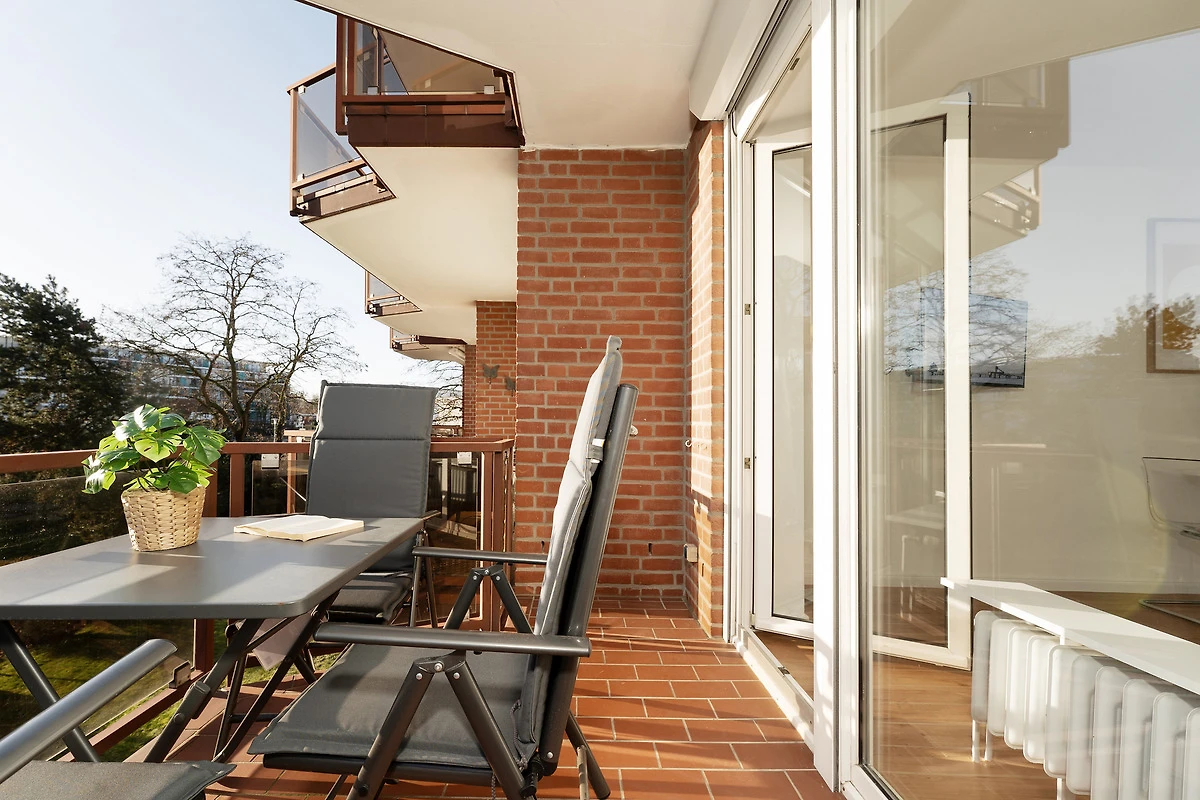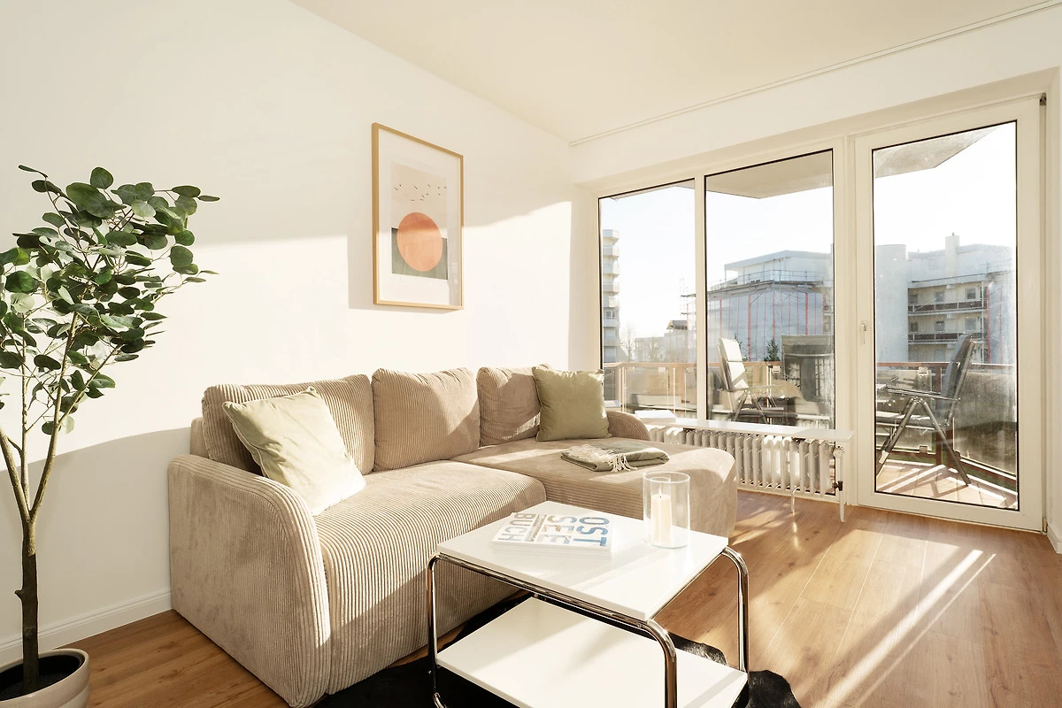 Willkommen in der Deichbude: Diese gemütliche Wohnung kombiniert modernen Komfort mit einer strandnahen Lage in Grömitz. Der Wohn- und Schlafbereich ist freundlich gestaltet und bietet ein Schlafsofa sowie einen Fernseher und ein Radio – ideal für entspannte Abende. Von hier aus gelangen Sie direkt auf einen der schönen möblierten Balkone, der nach Süden ausgerichtet ist und zum Verweilen einlädt.