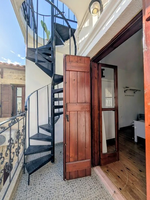 Über eine Holzwendeltreppe gelangt man in den ersten Stock. Hier erwartet sie ein Flur, geräumiges helles Schlafzimmer und ein Badezimmer mit Dusche. Vom Schlafzimmer aus hat man Zugang zum Balkon. Eine (sehr) schmale Eisenwendeltreppe führt von dort weiter auf die Dachterrasse.