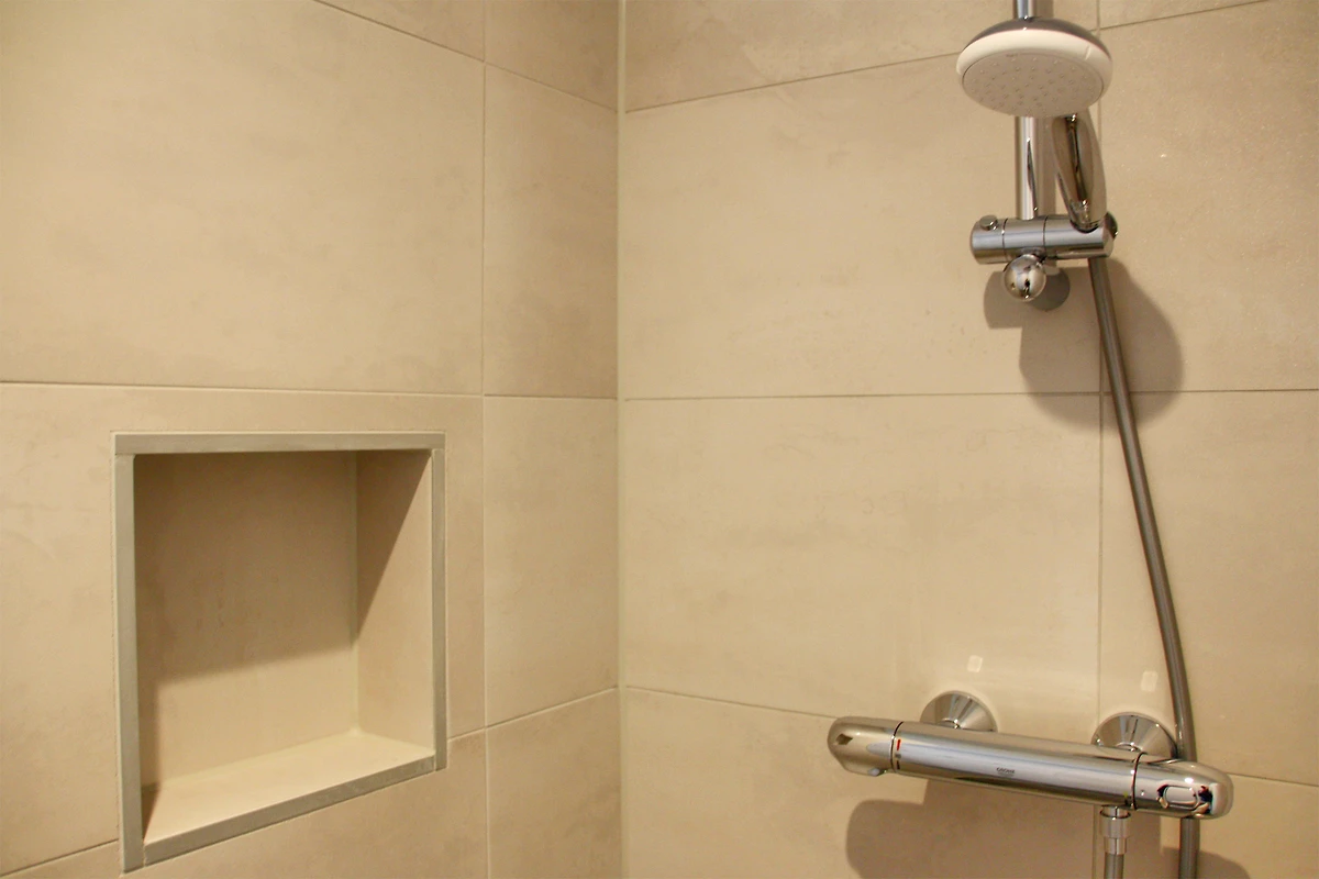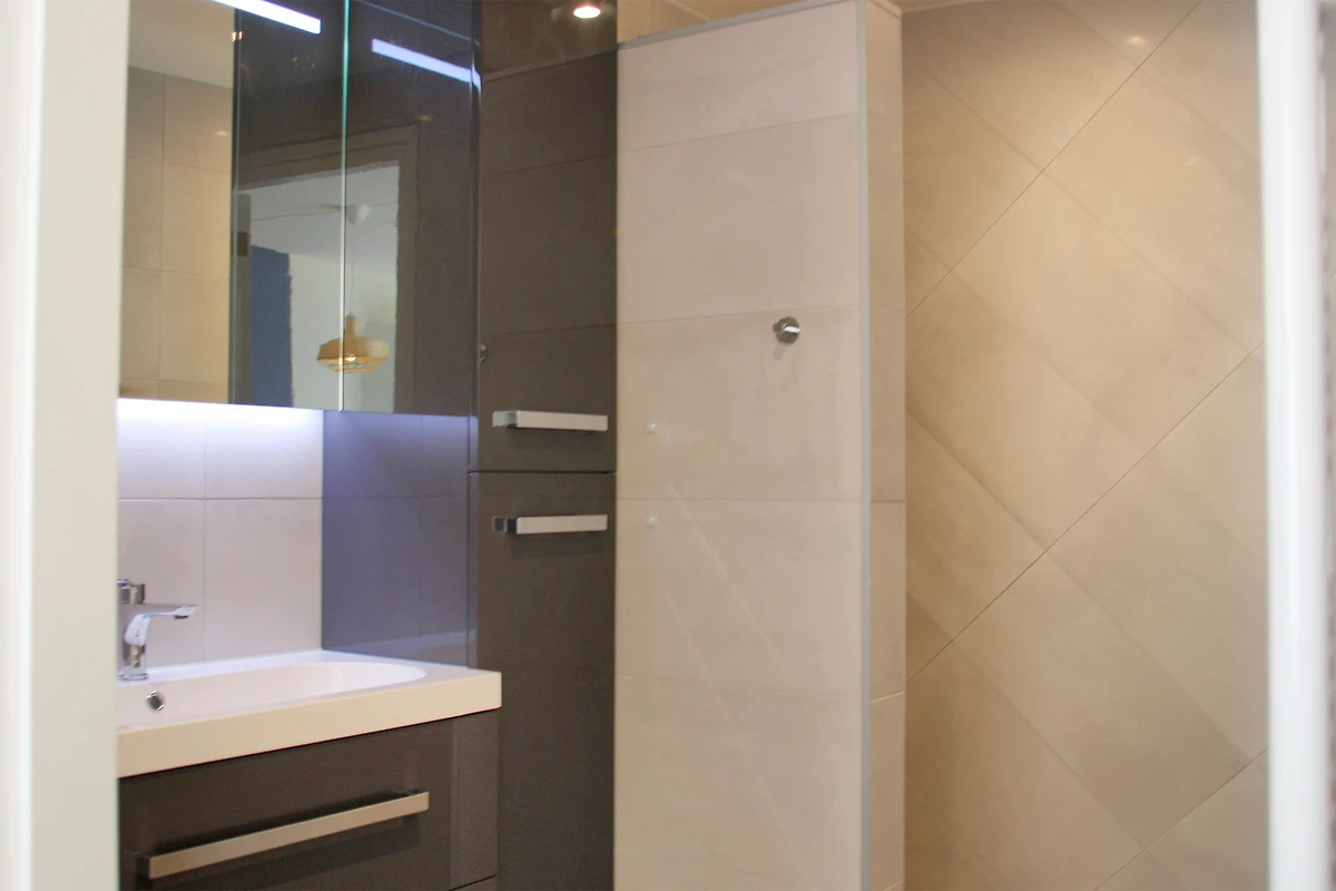 Die Wohnung verfügt über zwei gemütliche Schlafzimmer mit bequemen Betten und frischer Bettwäsche – ideal für erholsame Nächte nach einem Tag an Strand und Meer. Das moderne Badezimmer ist praktisch und gepflegt ausgestattet und verfügt unter anderem über eine Badewanne und einen großen Spiegel.