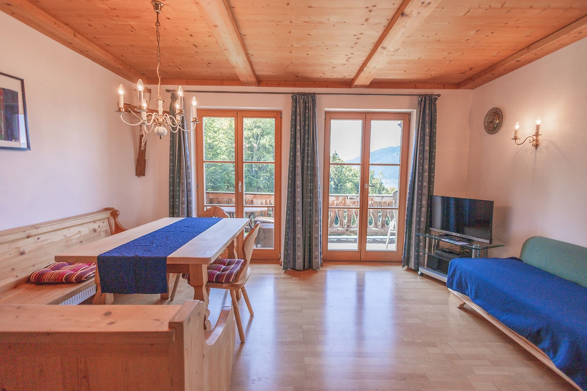Die Einrichtung der Ferienwohnung ist modern und geschmackvoll gestaltet, wobei besonders die Holzmöbel für eine gemütliche Atmosphäre sorgen. Vom Balkon aus geniessen Sie einen herrlichen Blick auf den idyllischen Tegernsee, der zum Verweilen und Geniessen einlädt.
