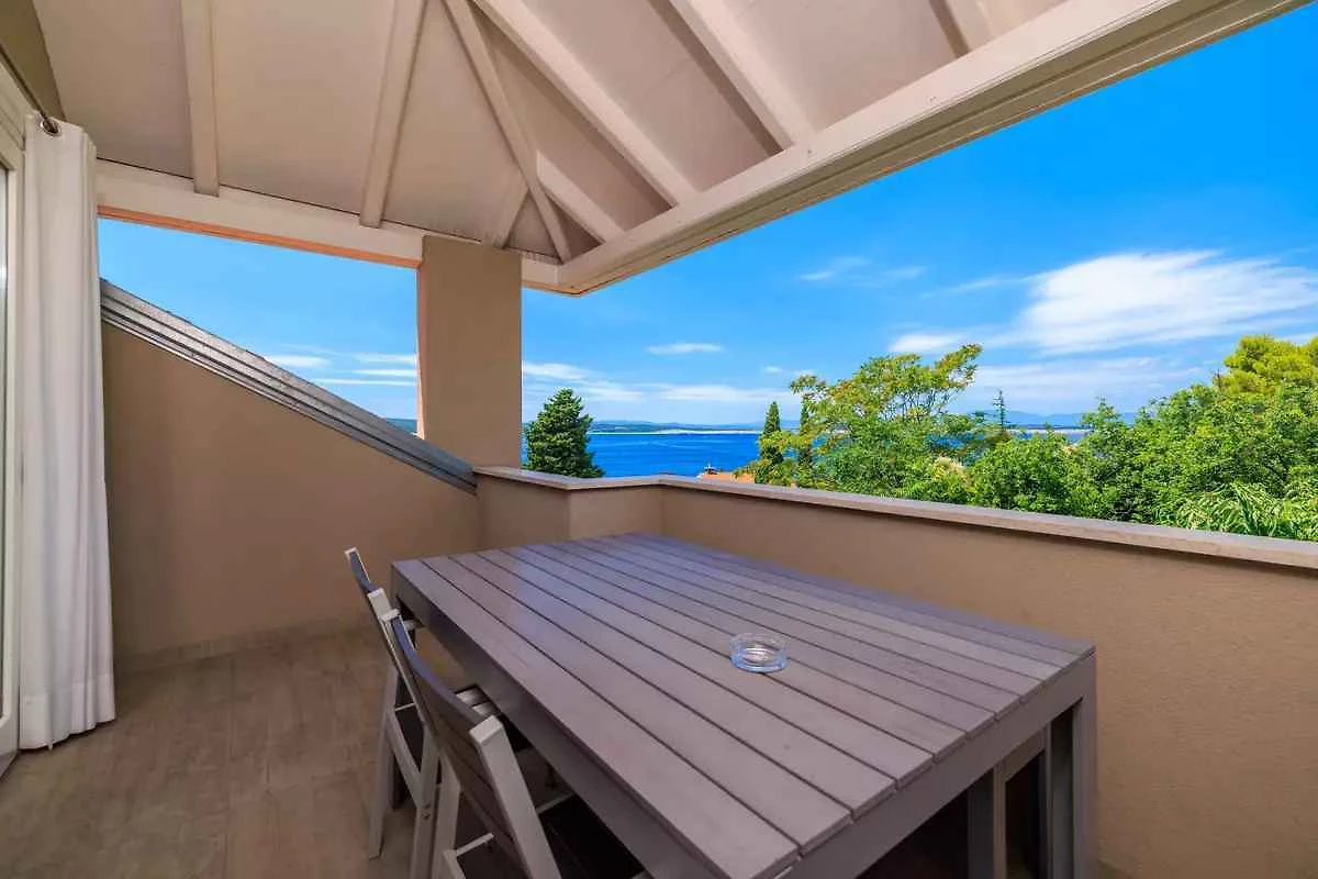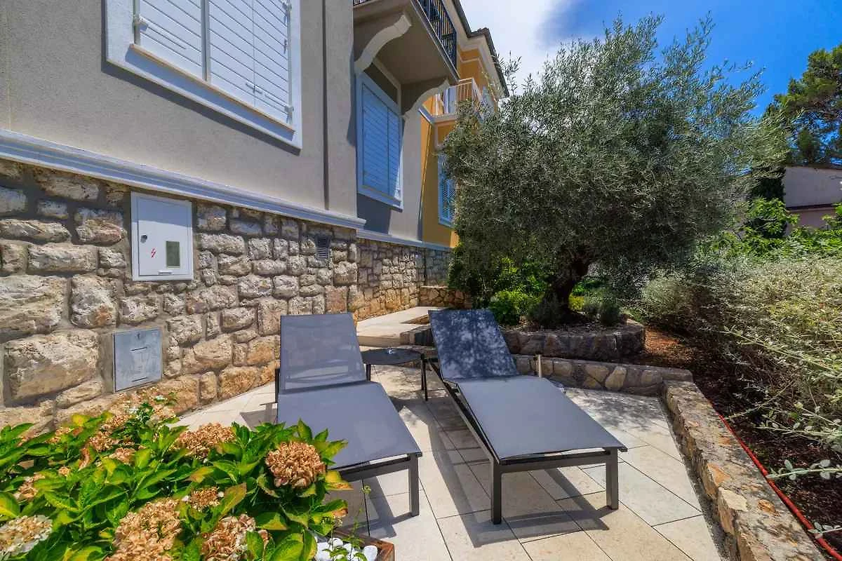 Die Ferienwohnung befindet sich in einem Apartementhaus, wurde im Jahr 2016 renoviert und ist modern eingerichtet. Das Grundstück liegt in einem Wohngebiet, am Ortsrand. Auch wegen des Ausblicks vom Grundstück auf das Meer und der sonnigen Lage ist das Domizil beliebt. Bei diesem Ferienobjekt handelt es sich um eine romatische Unterkunft. Zur gemeinsamen Nutzung stehen zur Verfügung: Terrasse und Gartenmöbel. 40 m² Terrasse im Erdgeschoss für alle Gäste zur gemeinsamen Nutzung.