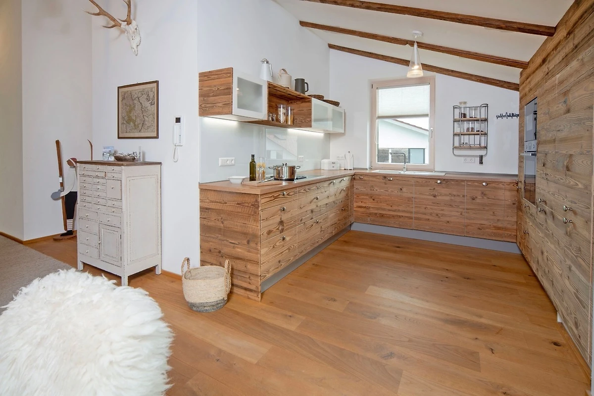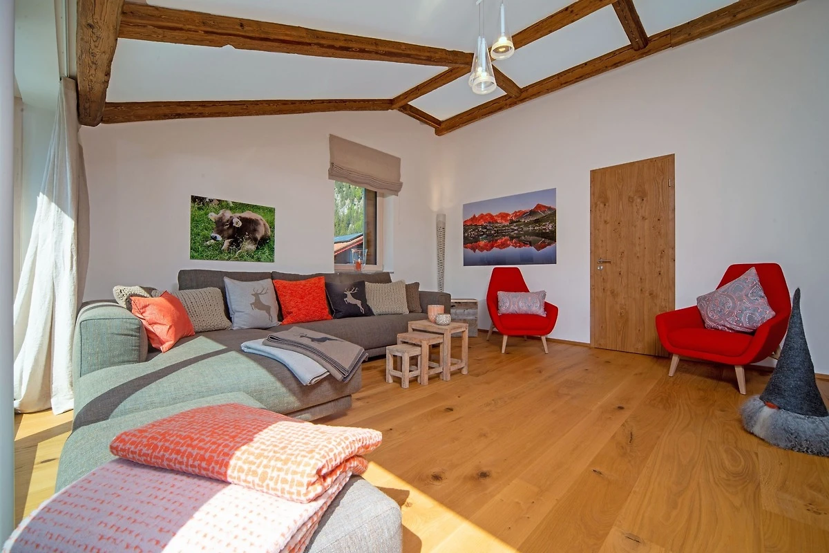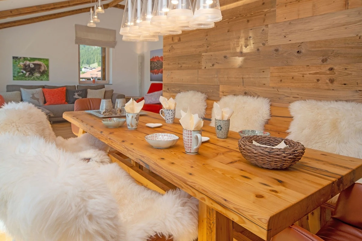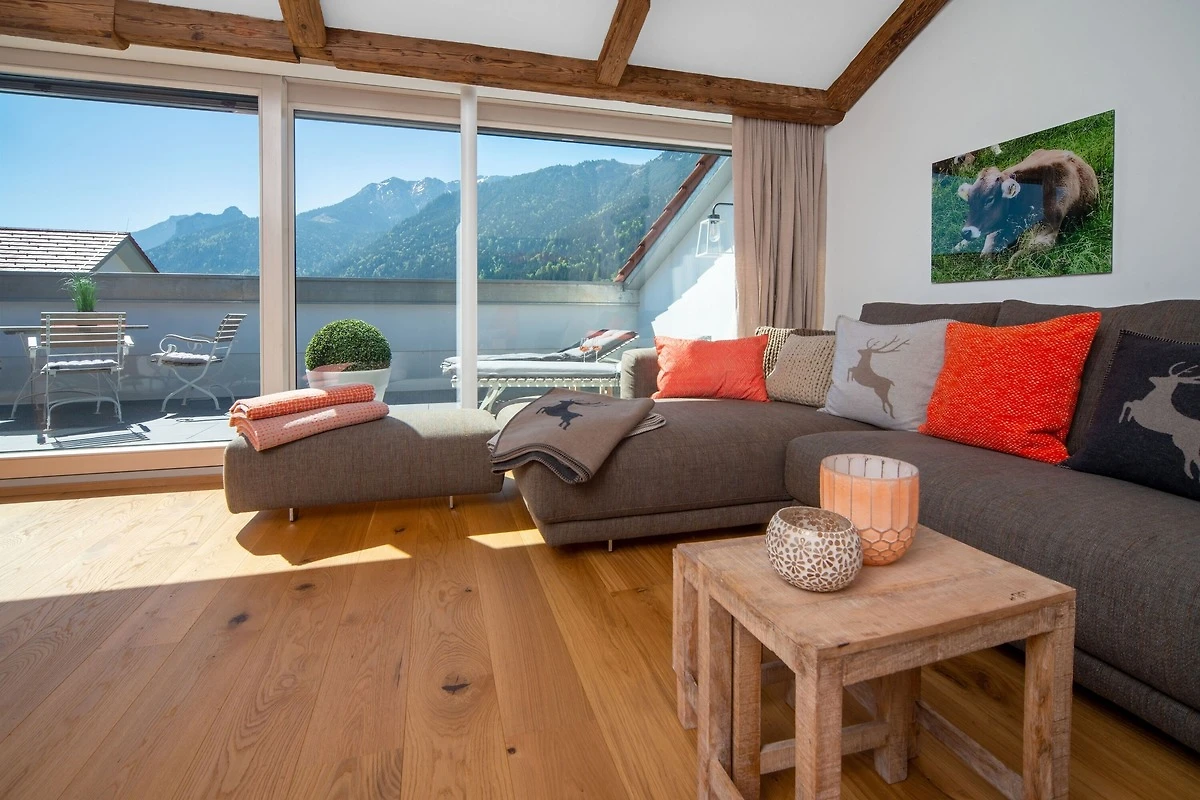Unschlagbarer Panorama-Bergblick - Der lichtdurchflutete Wohn-Essbereich mit Panorama-Bergblick begeistert mit Altholz-Elementen, Echtholzboden, grosser Couchlandschaft, Smart-TV, Bluetooth-Lautsprecher und einem Echtholz-Esstisch für 6 Personen.
