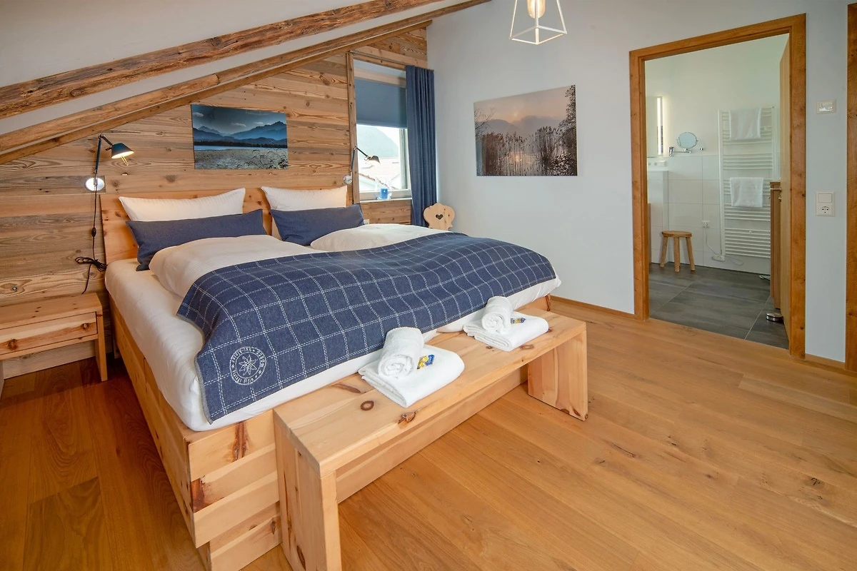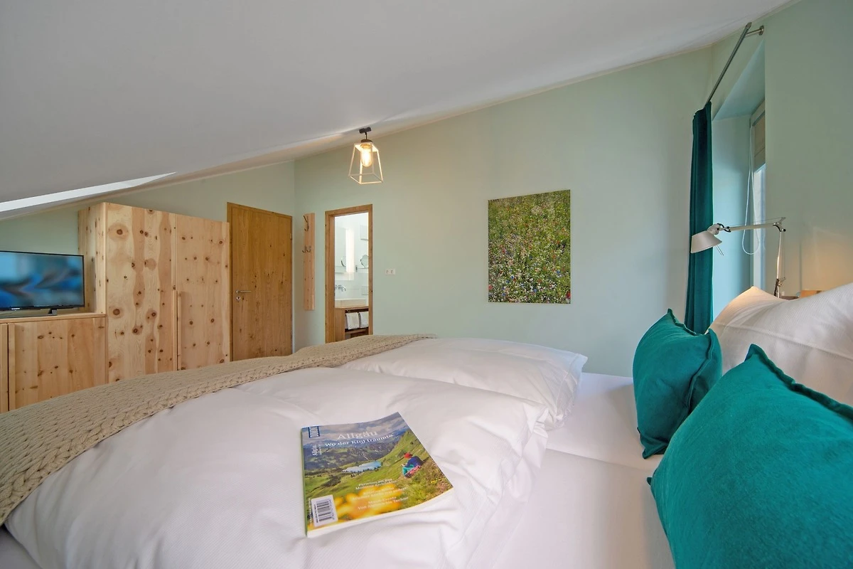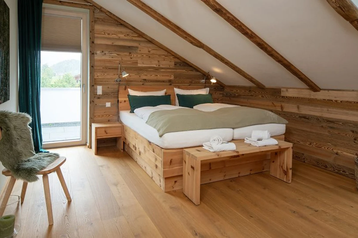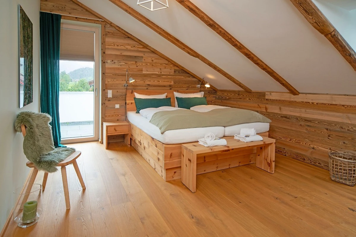 2 Zirbenholz-Doppelschlafzimmer (180x200) mit vom Schreiner gefertigte Zirben-Boxspringbetten auf höchstem Komfort, Zirben-Kleiderschrank, Kommode, Smart-TV und Verdunkelungsmöglichkeit durch Fensterläden/Plissees