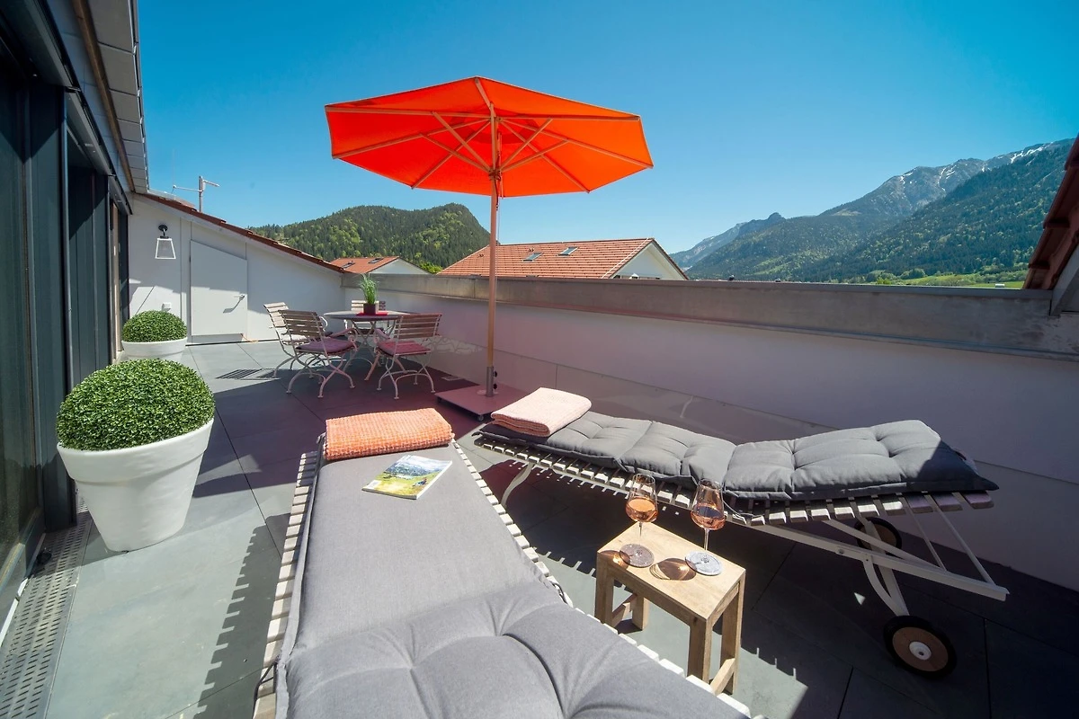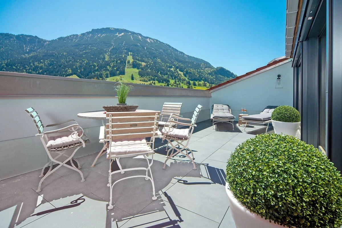 Tauchen Sie ein in den ultimativen Luxus dieser aussergewöhnlichen 4 Zimmer-Penthouse-Ferienwohnung mit 137 m² im exquisiten Chalet-Style. Mit drei Doppelschlafzimmern und ebenso vielen eleganten Badezimmern bieten wir Ihnen bis max. 6 Personen einen unvergleichlichen Komfort und Privatsphäre, die Sie verdienen. Jeder Raum ist mit raffinierter Eleganz gestaltet, von den hochwertigen Möbeln bis hin zu den stilvollen Details. Entspannen Sie im grosszügigen Wohn-Ess-Bereich und geniessen Sie dabei die herrliche Aussicht. Erleben Sie Ihren ganz persönlichen Rückzugsort auf der 20 qm grossen, uneinsehbarer Süd-Dachterrasse, die sich bequem über die Panorama-Schiebefront öffnet. Geniessen Sie die warme Sonne auf den komfortablen Liegestühlen, während Sie den atemberaubenden Panorama-Bergblick bewundern. Diese grosszügige Ferienwohnung vereint luxuriösen Komfort mit alpinem Charme – perfekt für alle, die Ruhe, Qualität und Natur lieben. Wohnen in bester Lage. Zwei reservierte Tiefgaragenplätze und ein privater Aufzug bringen Sie bequem und sicher direkt in Ihre Wohnung.