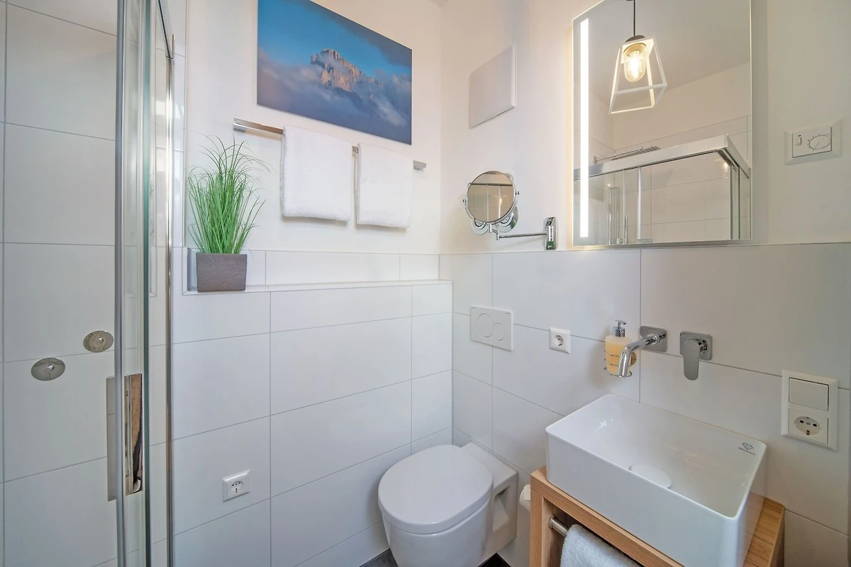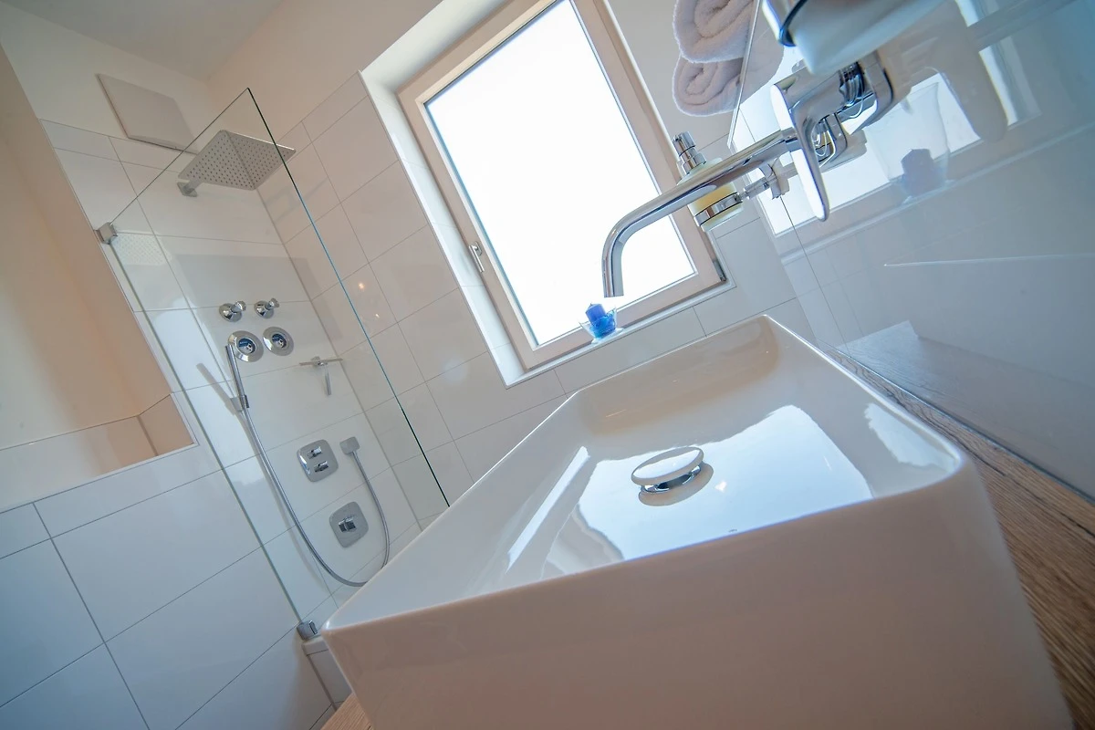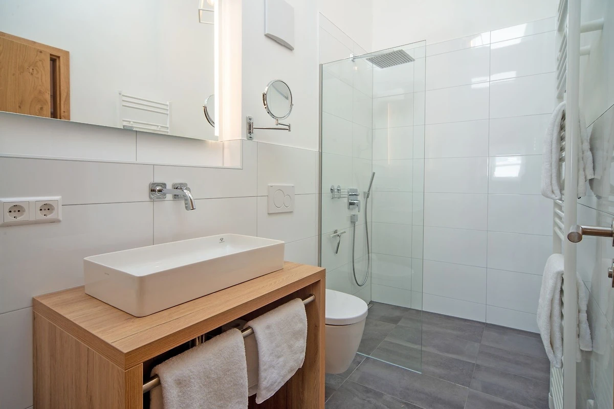 Drei stilvolle Badezimmer - Ein Tageslichtbad mit Badewanne und zwei moderne Bäder mit ebenerdiger Walk-In-Dusche, elektrischer Lüftung, Fussbodenheizung und Handtuchwärmer bieten Komfort und Privatsphäre für alle Gäste.