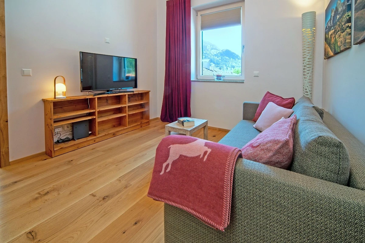 Wohn-Essbereich, im modernen alpinen Stil, hochwertig mit Altholz-Elementen und Echtholz-Fussboden, grosse gemütliche Couchlandschaft, Smart-TV, Bluetooth-Lautsprecher,