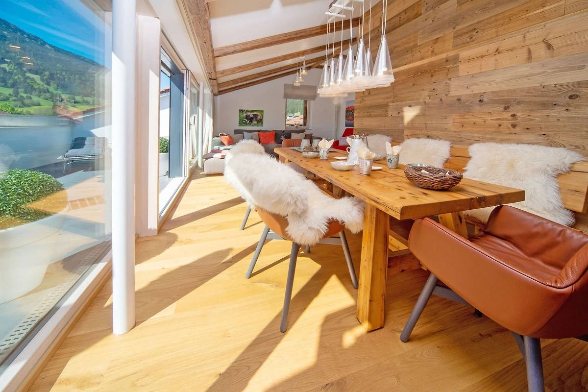 Essbereich mit grossem Echtholz-Esstisch für 6 Personen, extra-grosse Panorama-Schiebe-Fensterfront mit herrlichem Panorama-Bergblick, elektrische Jalousien, Zugang zur 20 qm grossen Süd-Dach-Terrasse, möbliert mit Tisch, Stühlen und 2 Liegestühlen