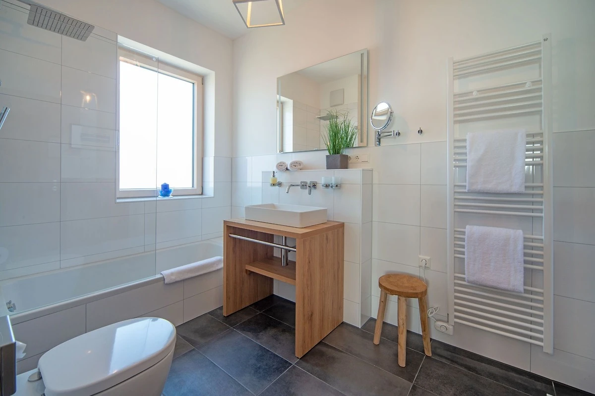 3 Badezimmer mit WC: 1 Tageslicht-Bad mit Badewanne, 2 Bäder mit ebenerdiger Walk-In-Dusche (mit elektrischem Lüftungssystem), Fussbodenheizung, 2 Bäder mit elektrischem Handtuchwärmer