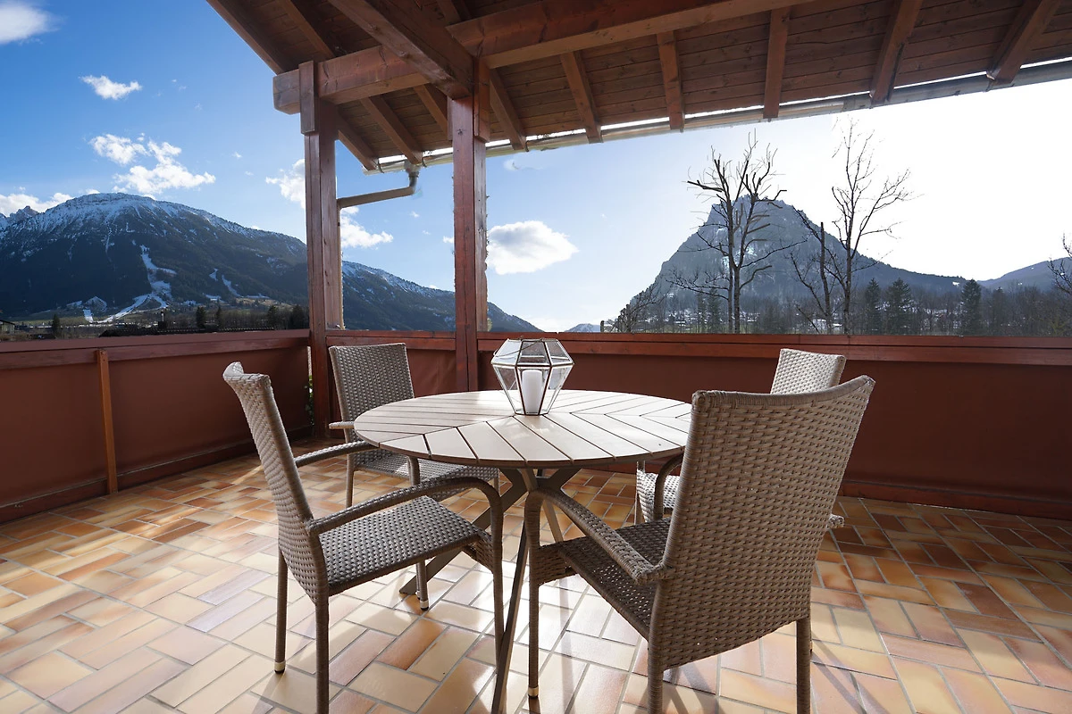 grosszügiger überdachter Balkon mit Berg- und Wiesenblick und Balkonmöbel