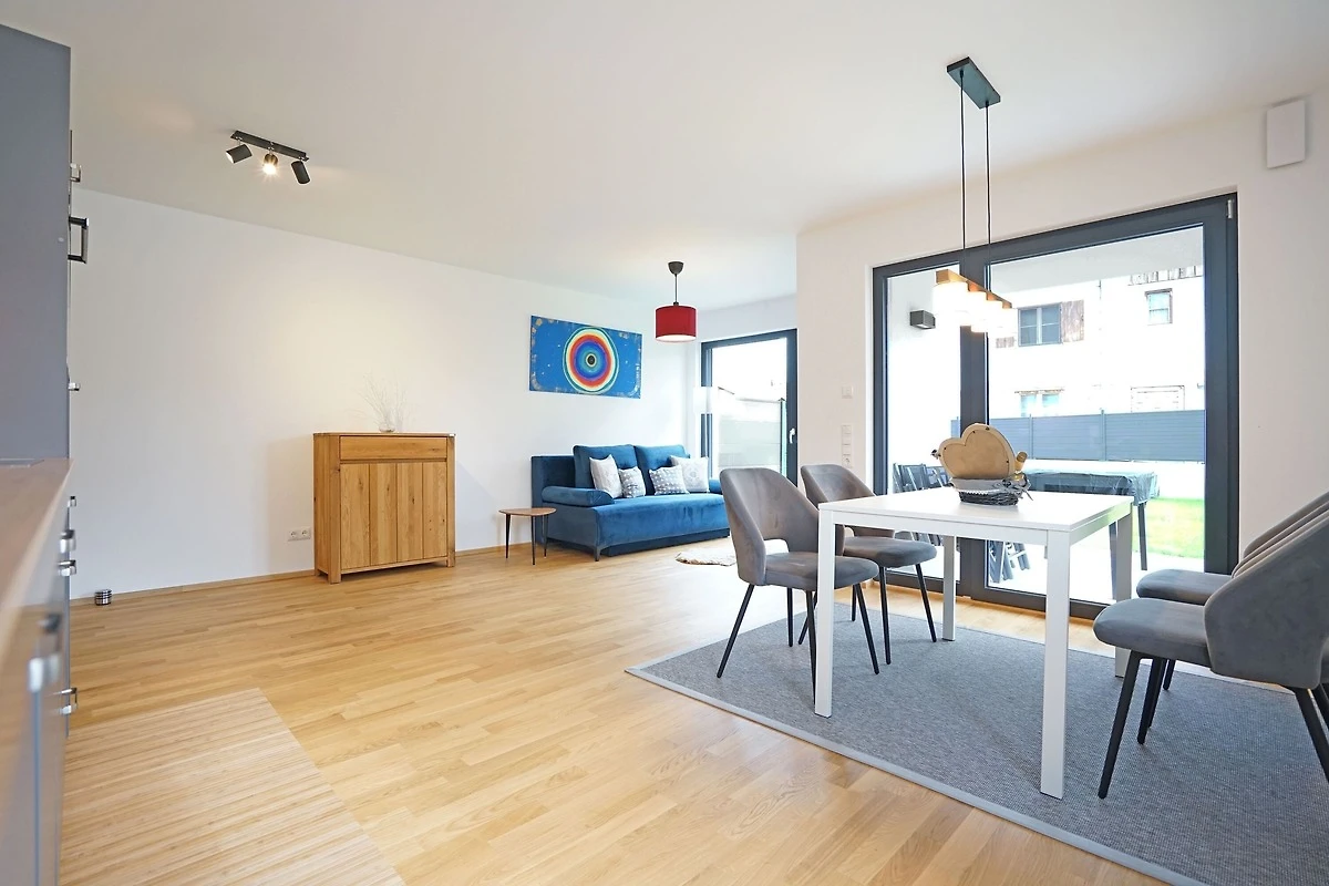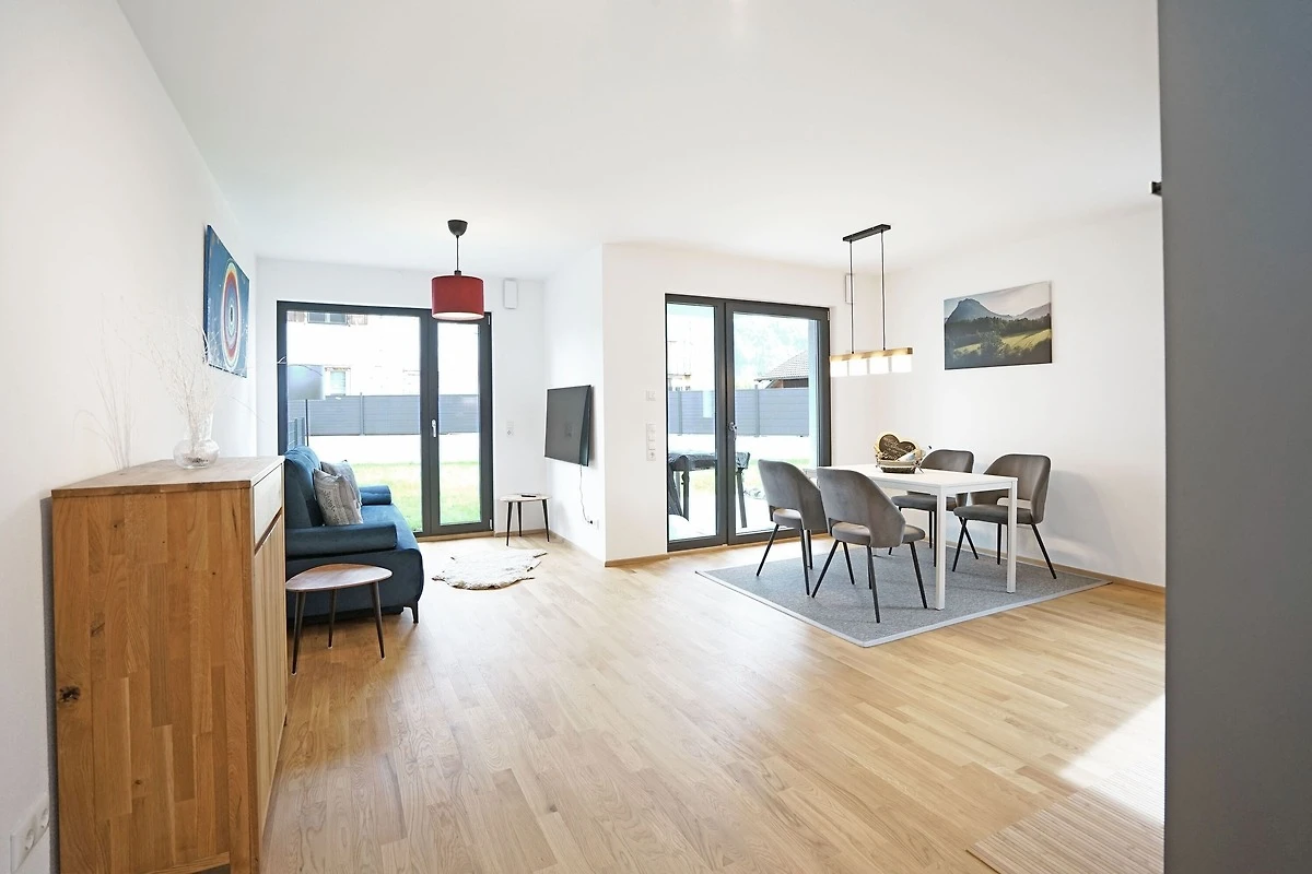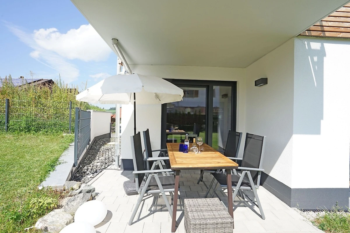 Erfreuen Sie sich an der hochwertig und modern ausgestatteten NEUBAU-Ferienwohnung mit Bergblick. Hier bleiben keine Wünsche offen. Eine voll ausgestattete Küche mit vielen Extras, einem geschmackvollen Essbereich mit Bergblick, ein freundlicher Wohnbereich mit Internet- Fernsehen, eine sonnige Terrasse mit Garten und Fussbodenheizung in der gesamten Wohnung wird auch Sie begeistern. Geniessen Sie ihre Auszeit - Sie haben es sich verdient!