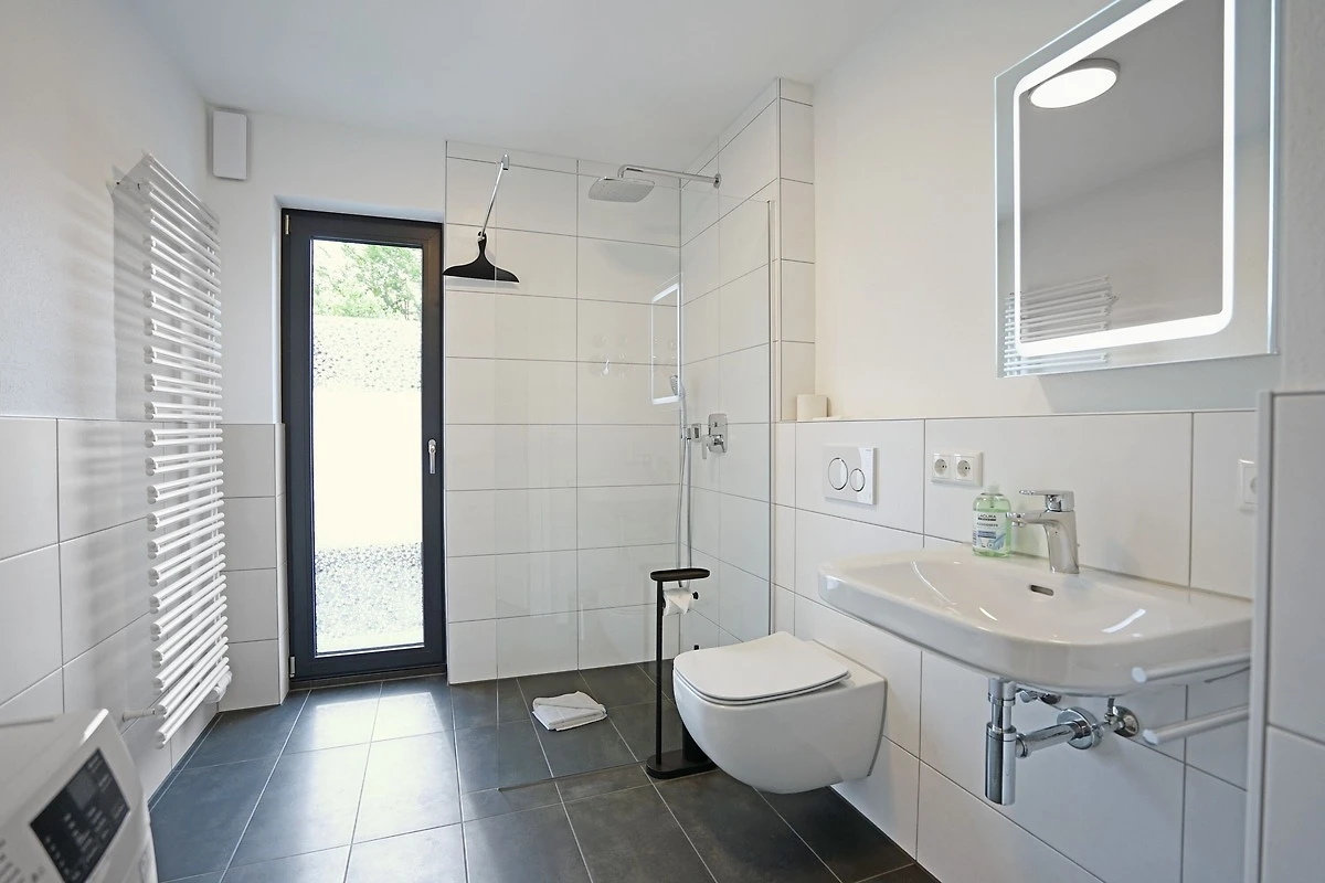Bad mit begehbarer Dusche, WC, Waschbecken mit Unterschrank, Handtuchheizung und Waschmaschine