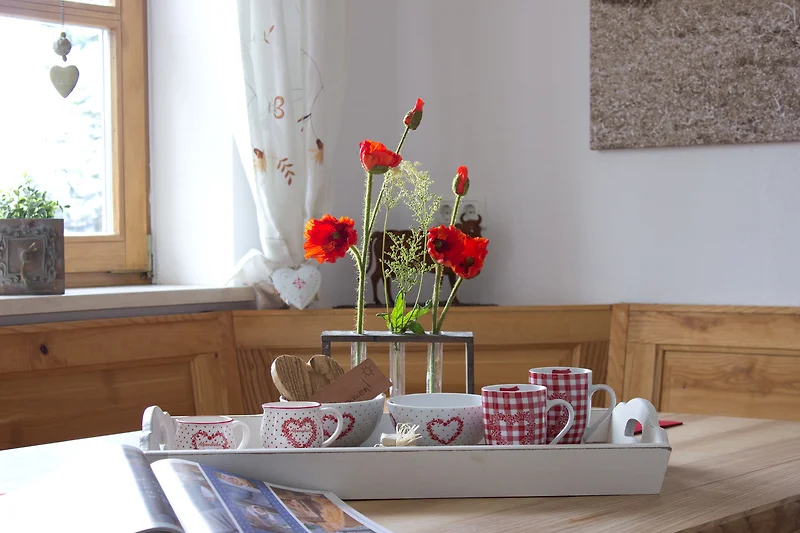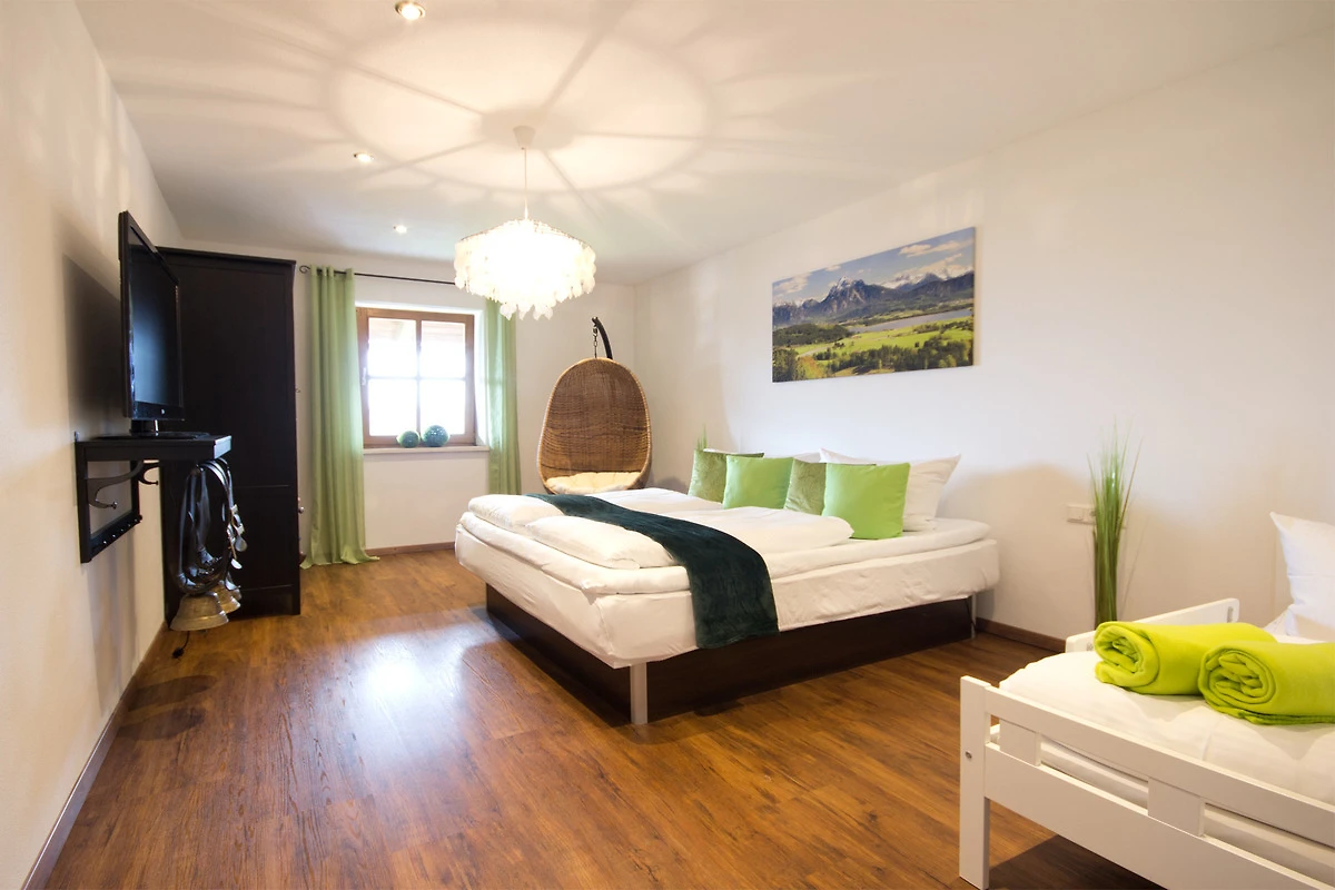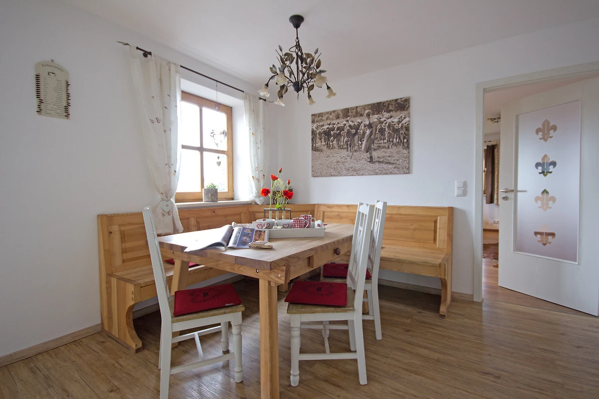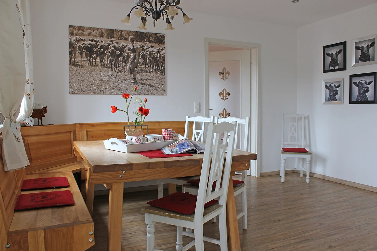 Die gemütliche ca. 130 m² grosse 3,5-Zimmer-Wohnung, ist ideal für 4-6 Personen und befindet sich im 2. Obergeschoss eines aktiv bewirtschafteten Bauernhofes, mit eigenem Zugang. Mit 2 Zustellbetten können bis zu 8 Personen beherbergt werden. Der lange Ostbalkon, ideal zum Frühstücken, mit schönem Blick in die Allgäuer Alpen. Täglich frische Milch direkt vom Bauernhof. Was will man mehr. Ein Kinderspielplatz liegt fussläufig in nur 2 minütiger Entfernung. Auch ein Besuch im Stall ist mit Voranmeldung zu den abendlichen Fütterungszeiten möglich. Gerüche, Geräusche und Kuhglocken gehören hier zum puren Landleben dazu.