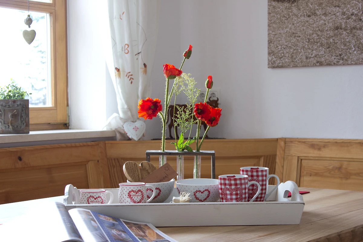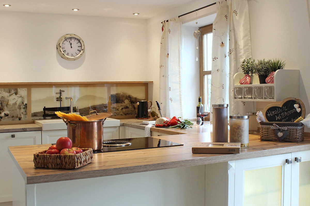 offener, grosszügiger Küche mit gemütlichem Essplatz im Allgäuer Stil, inkl. Speis
