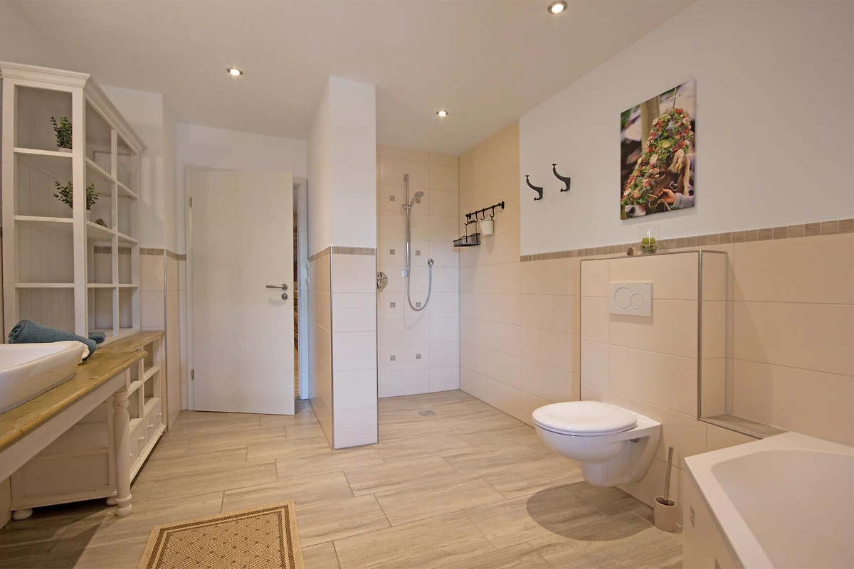 Badezimmer mit Badewanne, begehbarer Dusche und WC