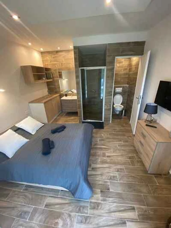 Der Eingang in Ihr Studio befindet sich im Erdgeschoss, ist ebenerdig und führt direkt in das Wohn/Schlafzimmer. Wohn/Schlafzimmer mit 1 Doppelbett, TV, Klimaanlage und Zugang zum Balkon. Kochecke im Wohn/Schlafzimmer mit Klimaanlage, Kühlschrank, Mikrowelle, Kaffeemaschine und elektrischem Wasserkocher. Bad mit Dusche, 1 Waschbecken und WC.