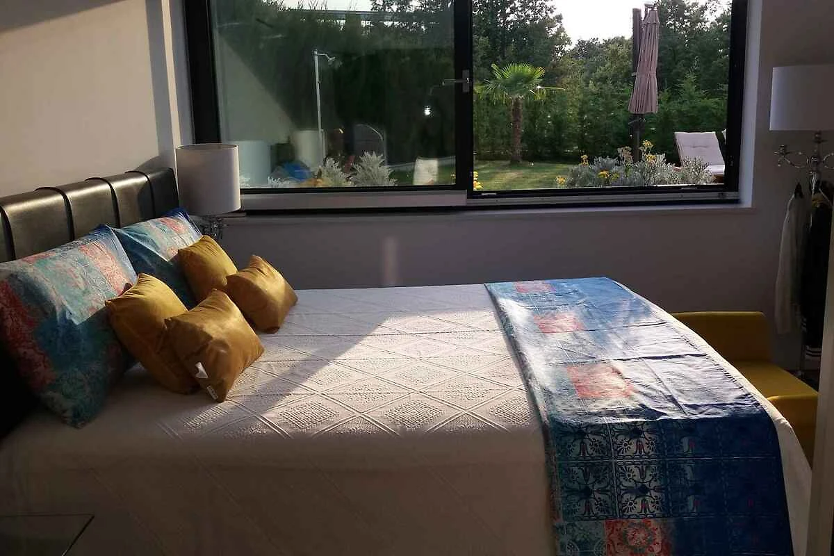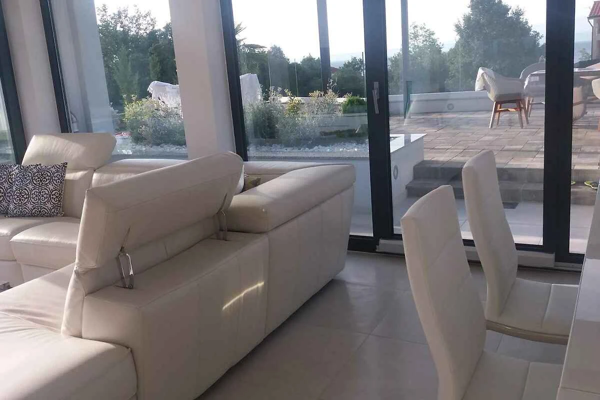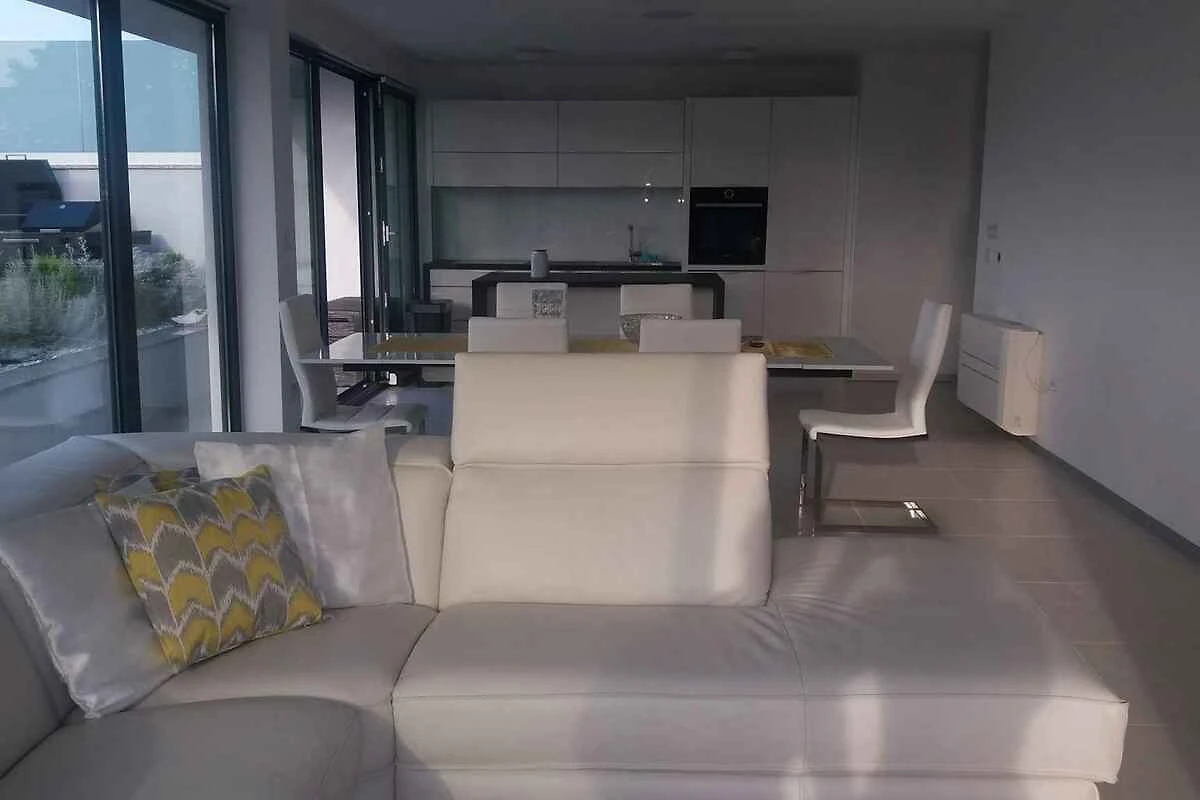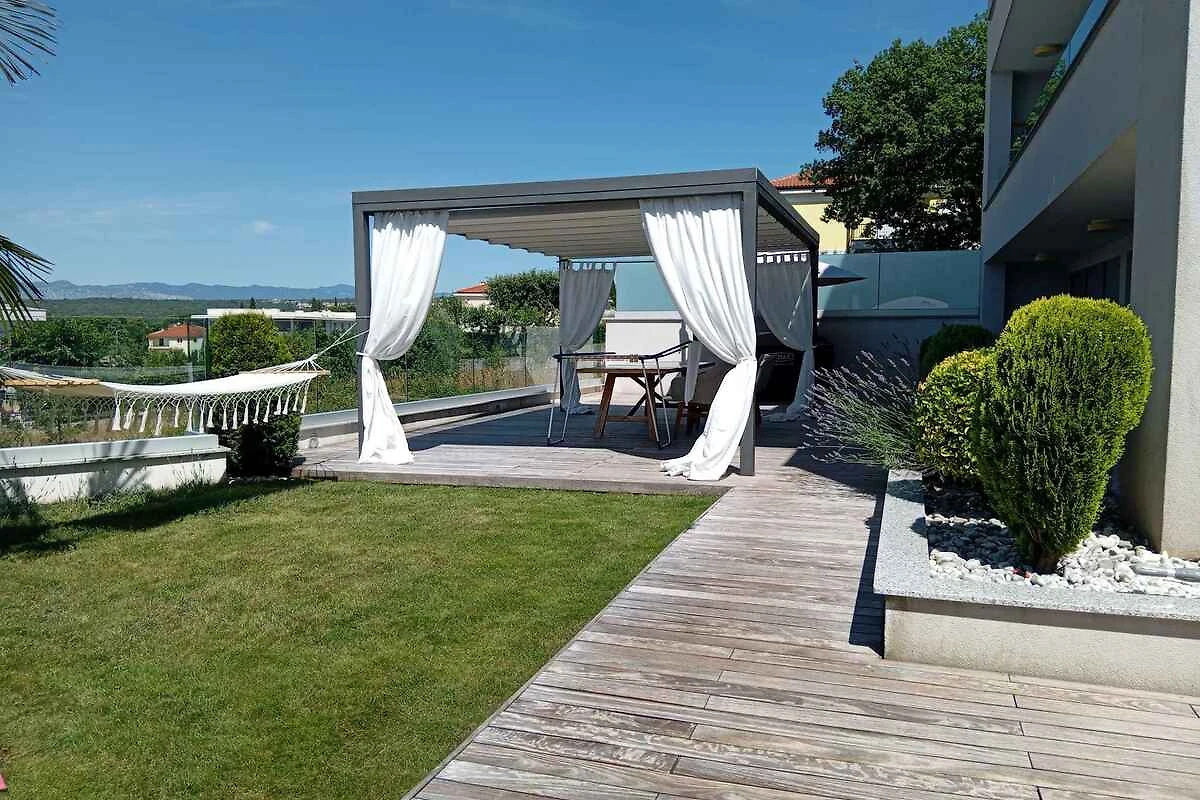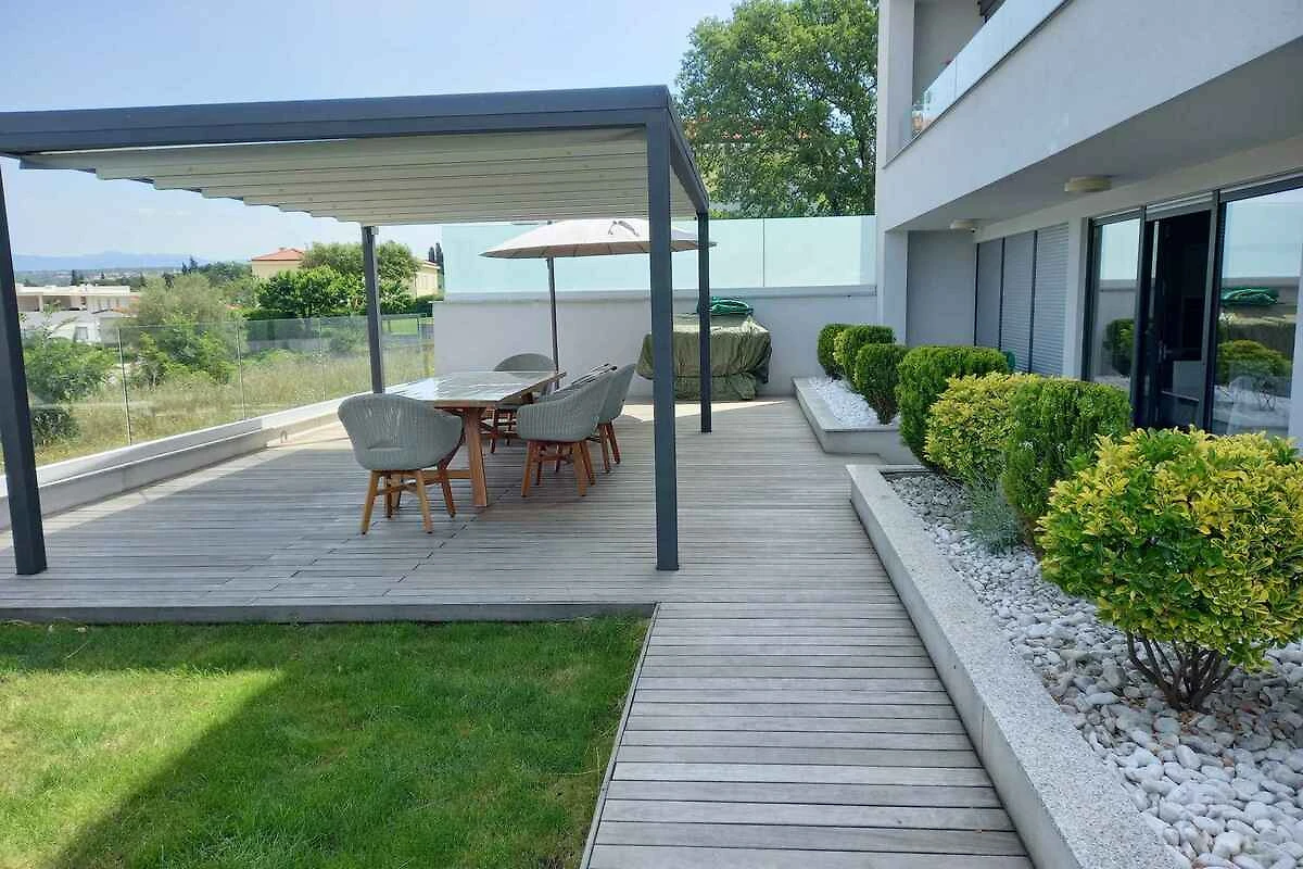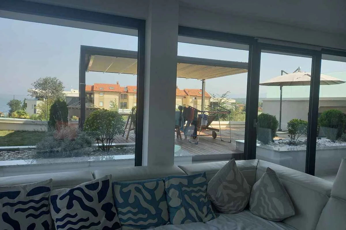 Malinska, Ortsteil Zidarići. Die Ferienwohnung befindet sich auf einem 900 qm grossen, geschlossenen Gartengrundstück mit Sträuchern, von einer Hecke begrenzt. Der Vermieter wohnt nicht im Haus oder auf dem Grundstück. Die Zufahrt erfolgt über eine Nebenstrasse (asphaltiert). Parkplatz (für 2 Pkws) auf dem Grundstück. Eine Ladestation für E-Autos gibt es im Ort (2,5 km).