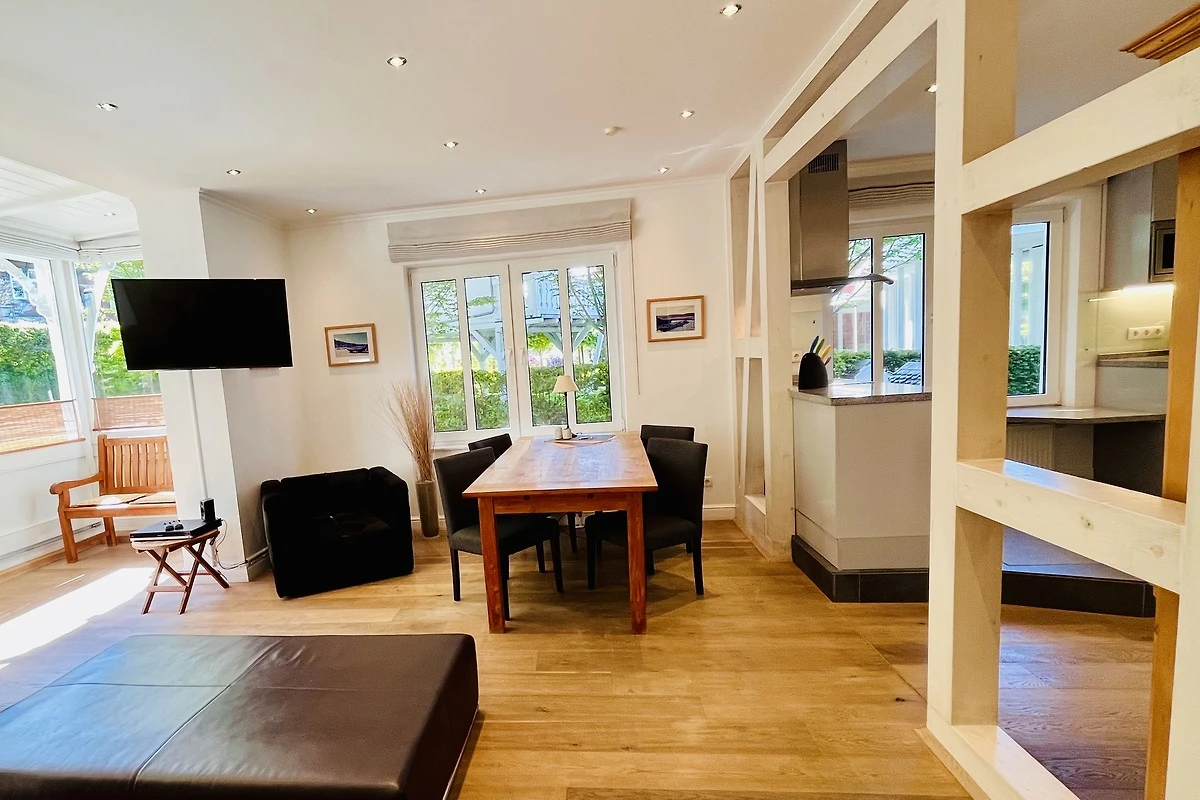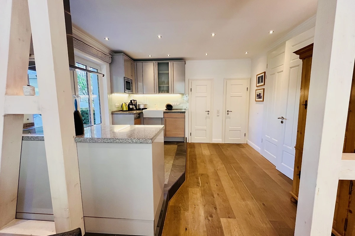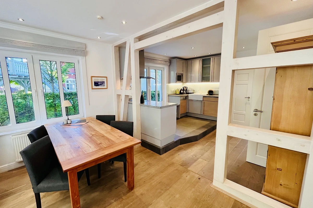 Schon beim Betreten des Appartements spüren Sie die angenehme Helligkeit und die einladende Atmosphäre. Eine dekorative Fachwerkwand trennt stilvoll Küche und Essbereich und unterstreicht den wohnlichen Charakter der Ferienwohnung.