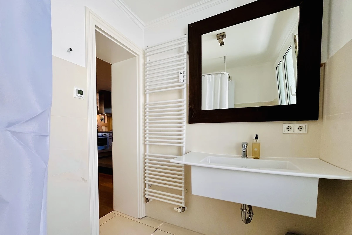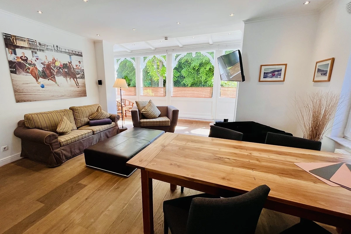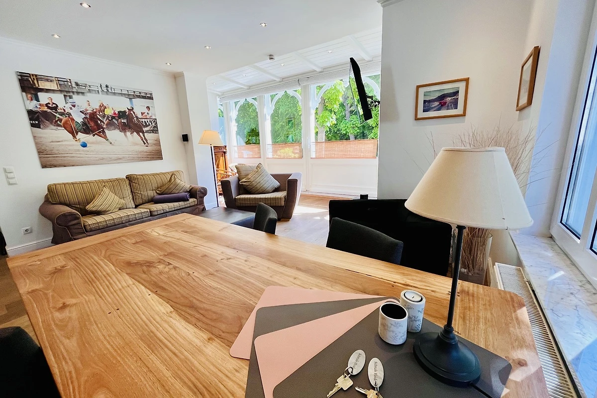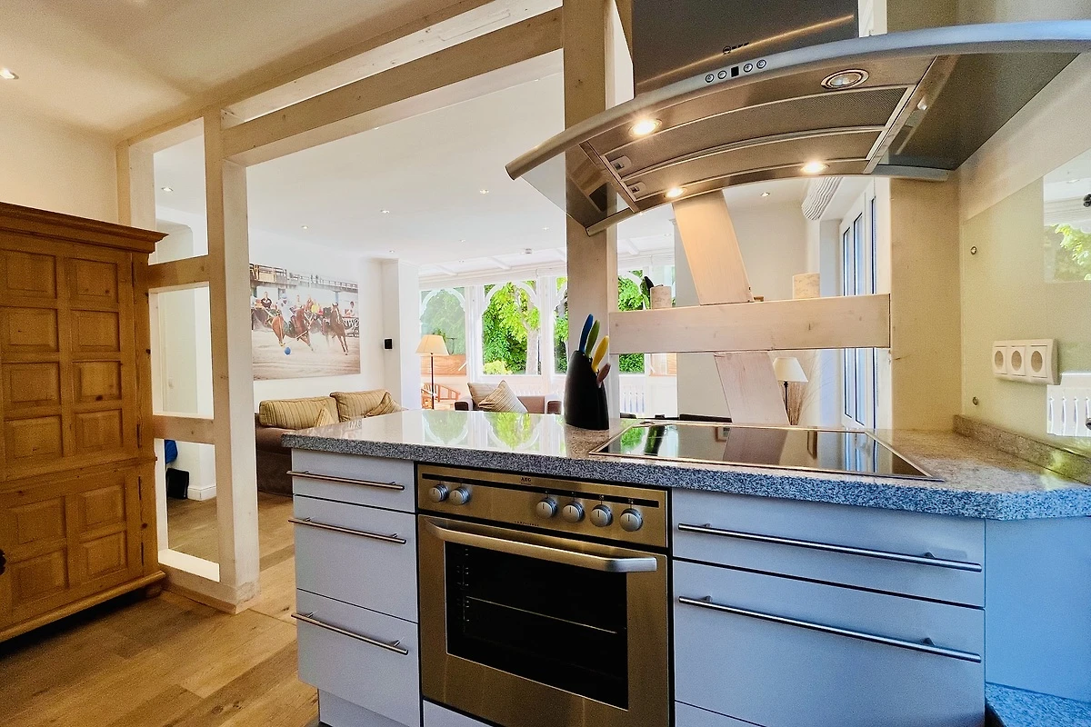 Schon beim Betreten des Appartements spüren Sie die angenehme Helligkeit und die einladende Atmosphäre. Eine dekorative Fachwerkwand trennt stilvoll Küche und Essbereich und unterstreicht den wohnlichen Charakter der Ferienwohnung.