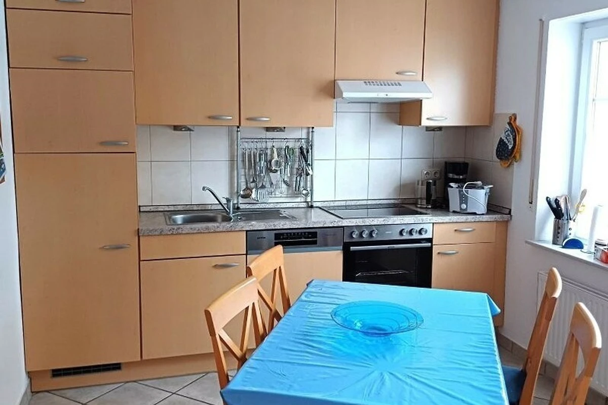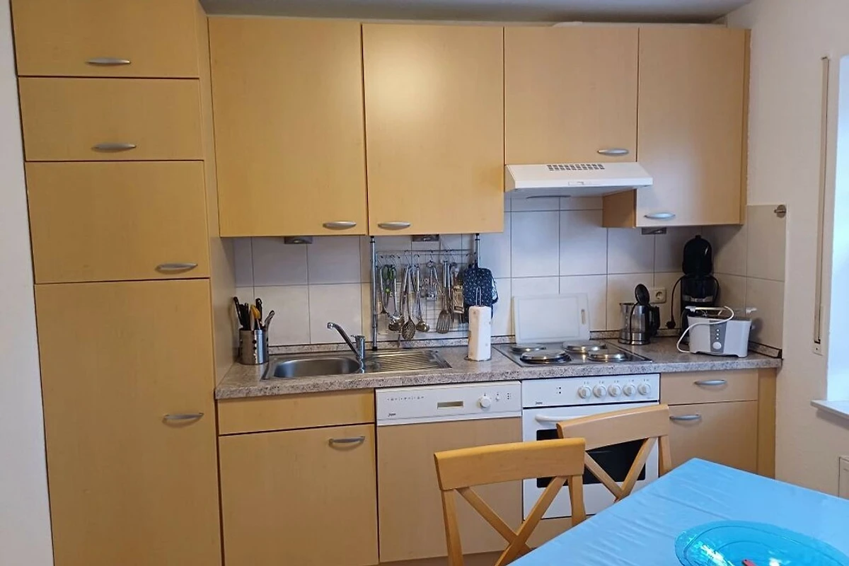 Küche: Küchenzeile mit Herd (Ceranfeld), Backofen, Mikrowelle, Toaster, Wasserkocher, Kaffeemaschine, Kochutensilien aller Art, Geschirr, Besteck, Essbereich