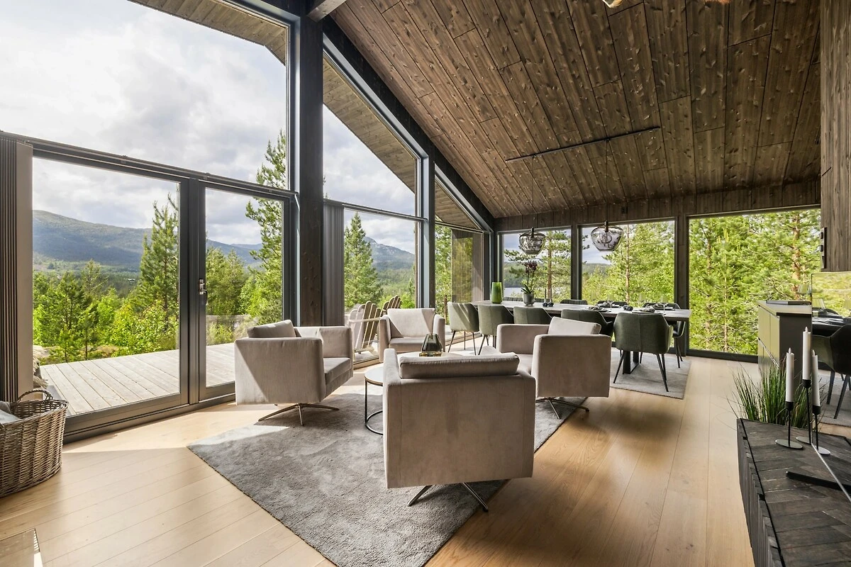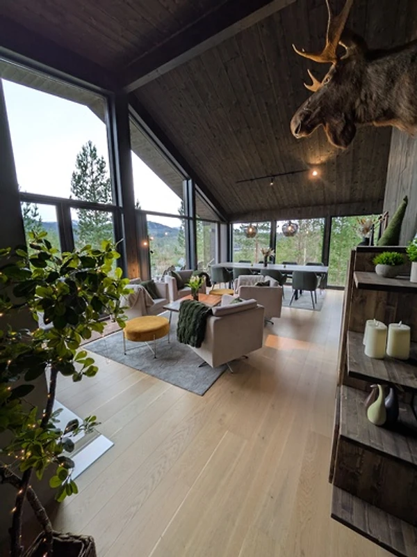 Am Fuße des Lifjell erwartet Sie eine moderne Hütte in traumhafter Lage, mit einem beeindruckenden Blick auf den Nystulvatn, den majestätischen Berg Himingen und die weitläufige, grüne Natur. Genießen Sie hier einmalige Naturerlebnisse zusammen mit modernem Komfort – inklusive Sauna und Kamin, die auch an kühleren Abenden für wohltuende Entspannung sorgen.