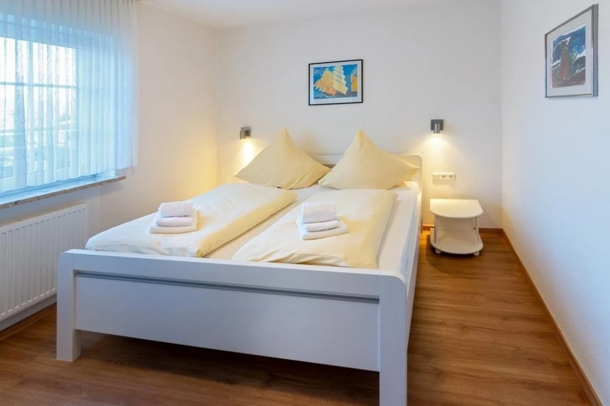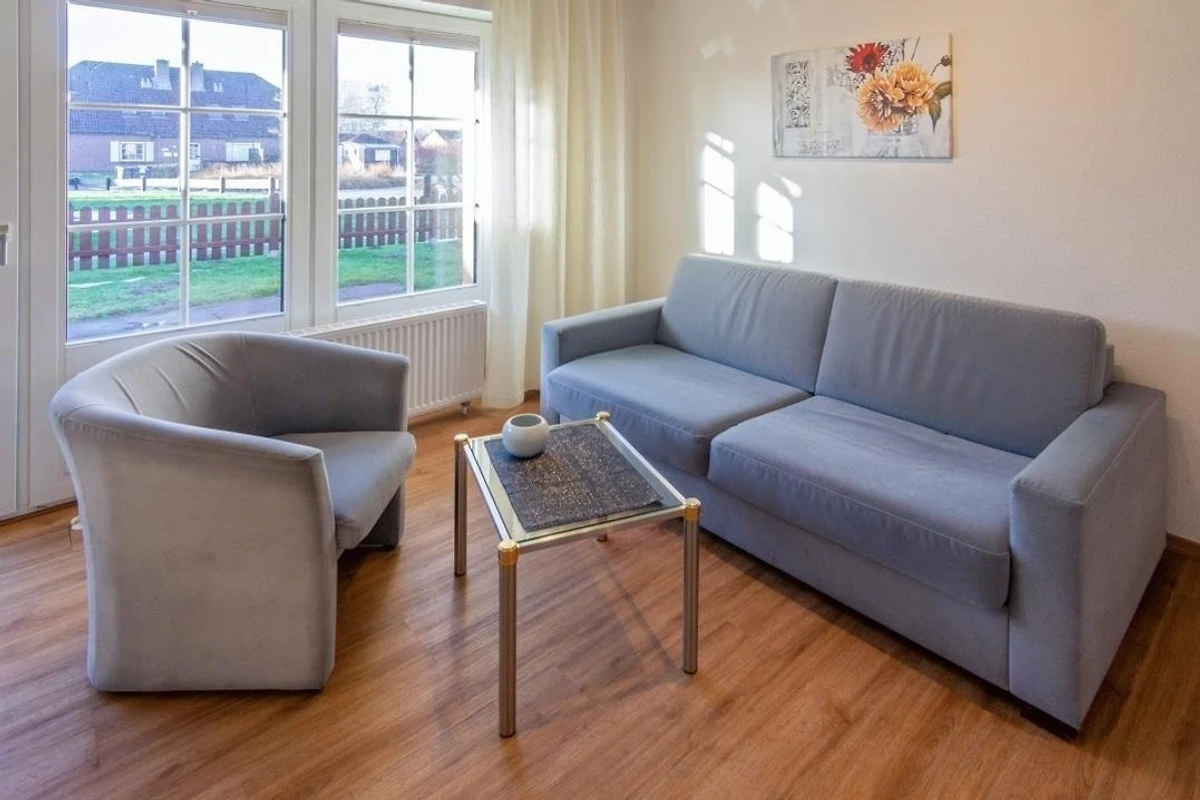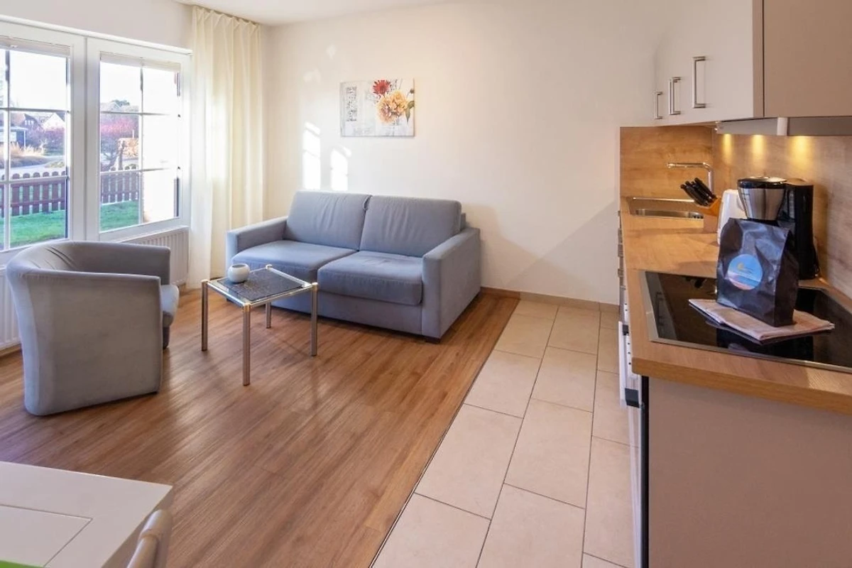 Die Erdgeschosswohnung überzeugt durch ihren hellen, freundlich eingerichteten Wohn‑ und Essbereich, der durch grosse Fenster viel Tageslicht erhält und sofort eine warme Urlaubsatmosphäre schafft. Hier befindet sich auch eine hochwertige Schlafcouch, die neben dem separaten Schlafzimmer eine zusätzliche Schlafmöglichkeit bietet. Vom Wohnbereich aus gelangen Gäste direkt auf die sonnige Terrasse mit angrenzendem Garten – ein echtes Highlight dieser Ferienwohnung, das zu entspannten Stunden an der frischen Nordseeluft einlädt.