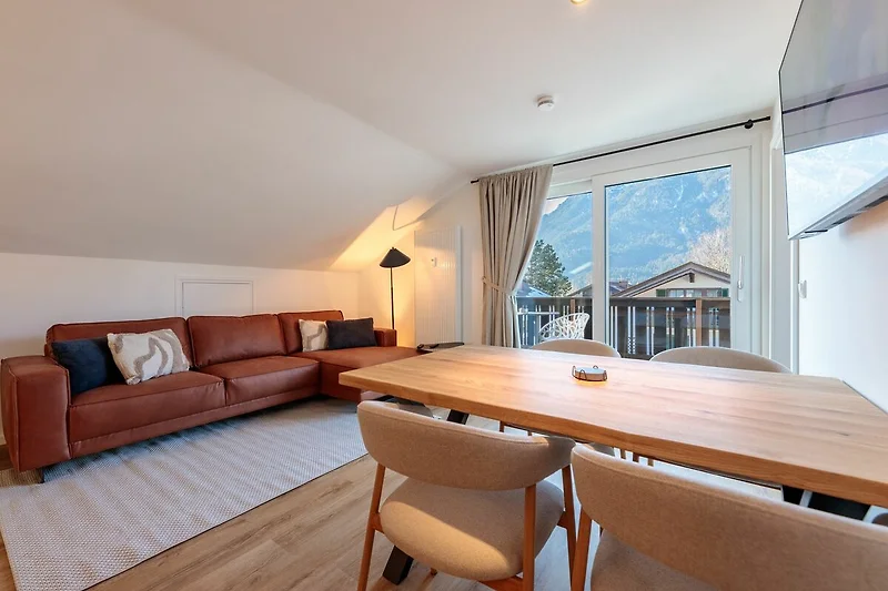 Ein besonderes Highlight ist der Balkon mit Sitzmöbeln und einem wunderbaren Bergblick. Hier können Sie Ihren Morgenkaffee in der Sonne genießen oder den Tag entspannt mit Blick auf die umliegende Natur ausklingen lassen.