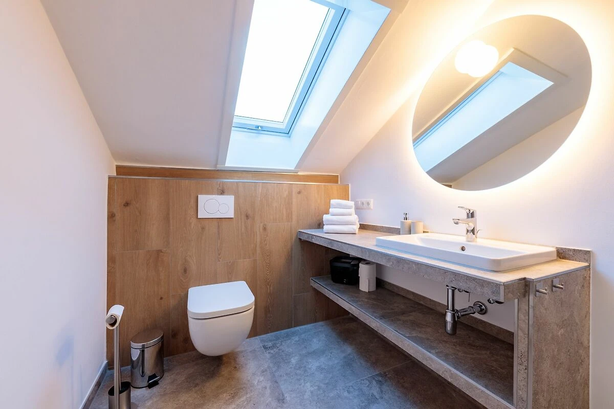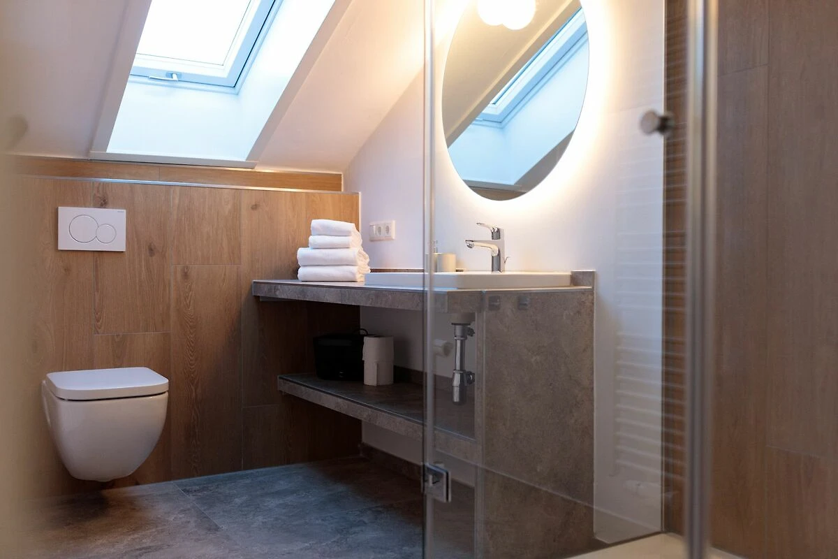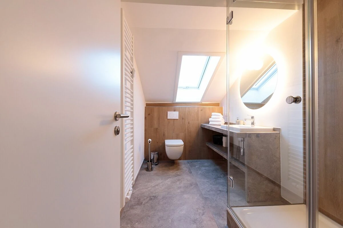 Das Tageslichtbad mit Dachschräge verfügt über eine Dusche, ein Waschbecken sowie eine Toilette und sorgt für einen angenehmen Start in den Tag.