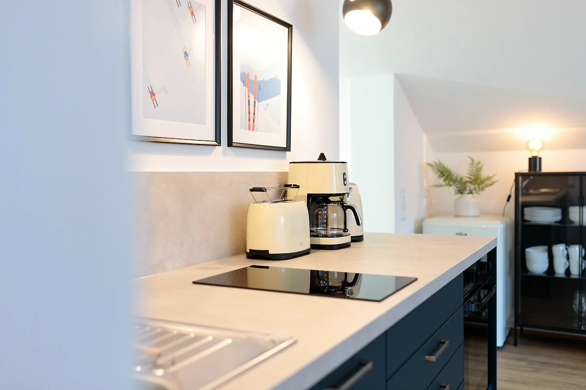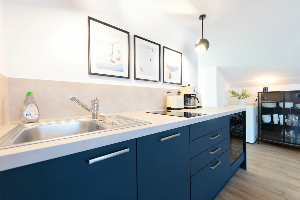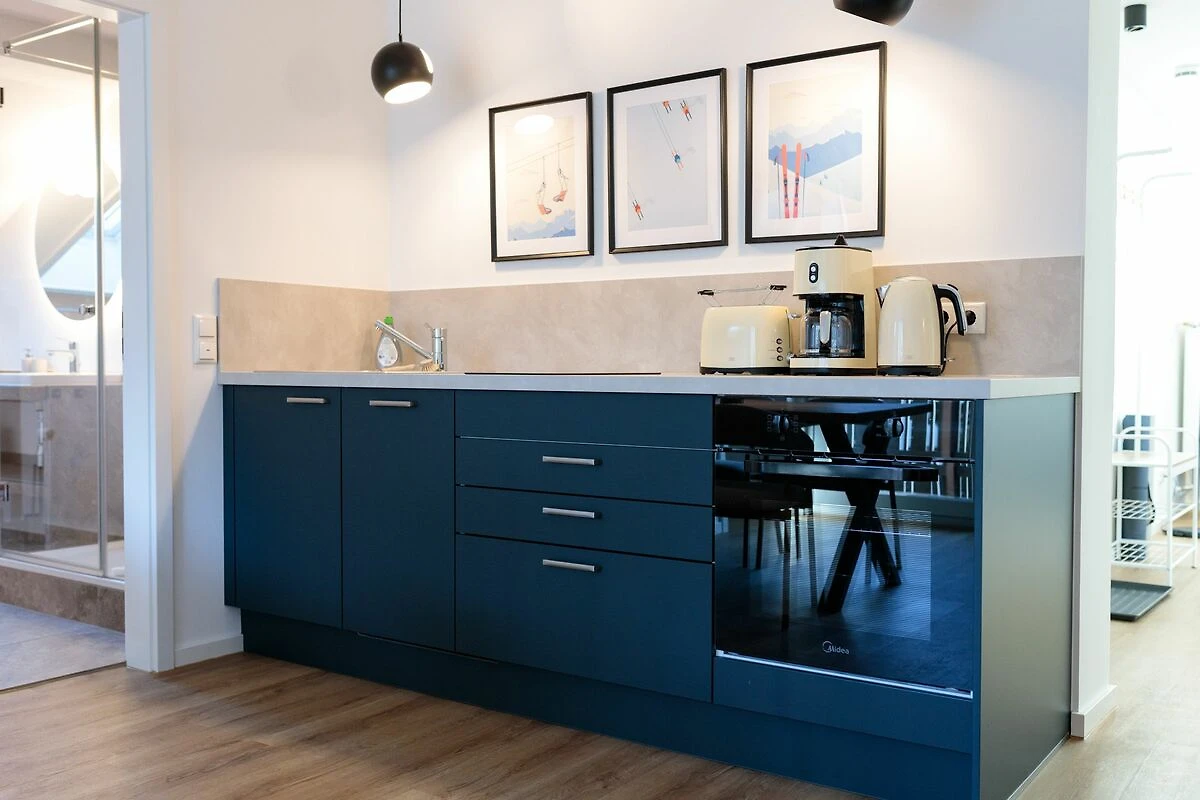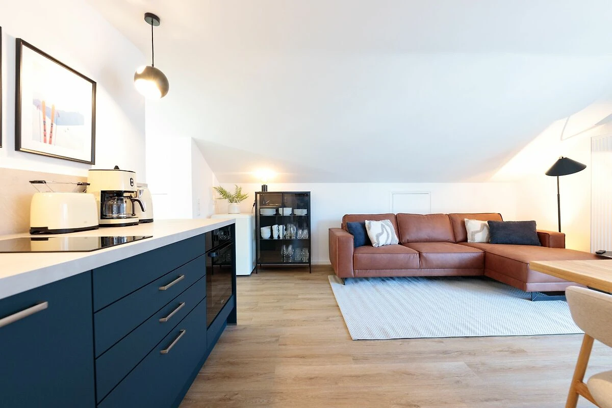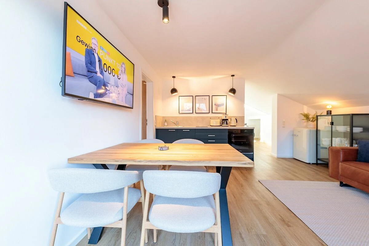 Der offen gestaltete Wohn- und Essbereich bildet das Herzstück der Wohnung. Ein gemütliches Sofa, ein Essplatz für bis zu vier Personen sowie ein TV-Gerät laden zu entspannten Stunden ein. Die moderne Küchenzeile ist vollständig ausgestattet und bietet alle notwendigen Küchenutensilien, damit Sie sich während Ihres Aufenthalts ganz flexibel selbst versorgen können.