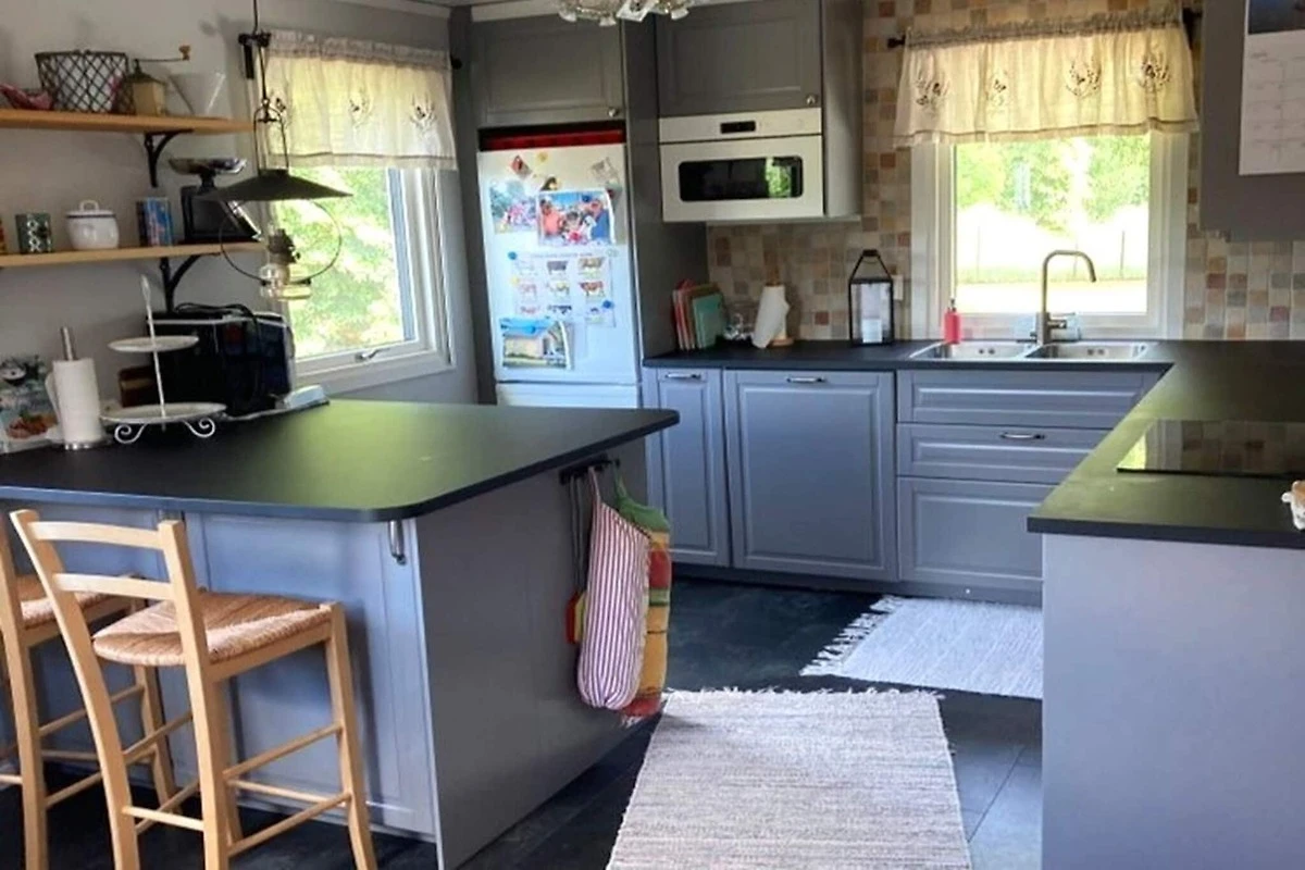 , Küche(Kochherd(elektrisch), Kaffeemaschine, Mikrowelle, Spülmaschine, Kühl-/Gefrierkombination), Wohn-/Schlafzimmer(TV, Kaminofen), Schlafzimmer(Doppelbett), Schlafzimmer(Einzelbett), Schlafzimmer(Einzelbett), Badezimmer(Waschbecken, Dusche, Toilette, Waschmaschine), Balkon, Balkon, Heizung(elektrisch), Garten, Gartenmöbel, Gartenmöbel, Gartenmöbel, Parkplatz, Liegestühle