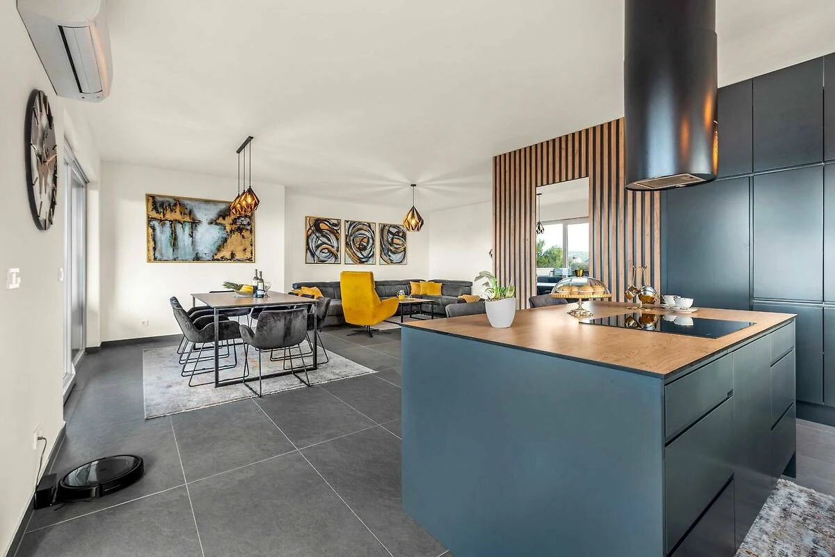 Dieses offene küche, mit induktions-kochfeld, ist ausgestattet in kühlschrank, mikrowelle, backofen, gefrierschrank, spülmaschine, geschirr/besteck, kochutensilien, kaffeemaschine, toaster, wasserkocher, herdplatte, teller und schüsseln, küchengeschirr.